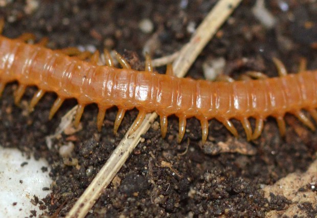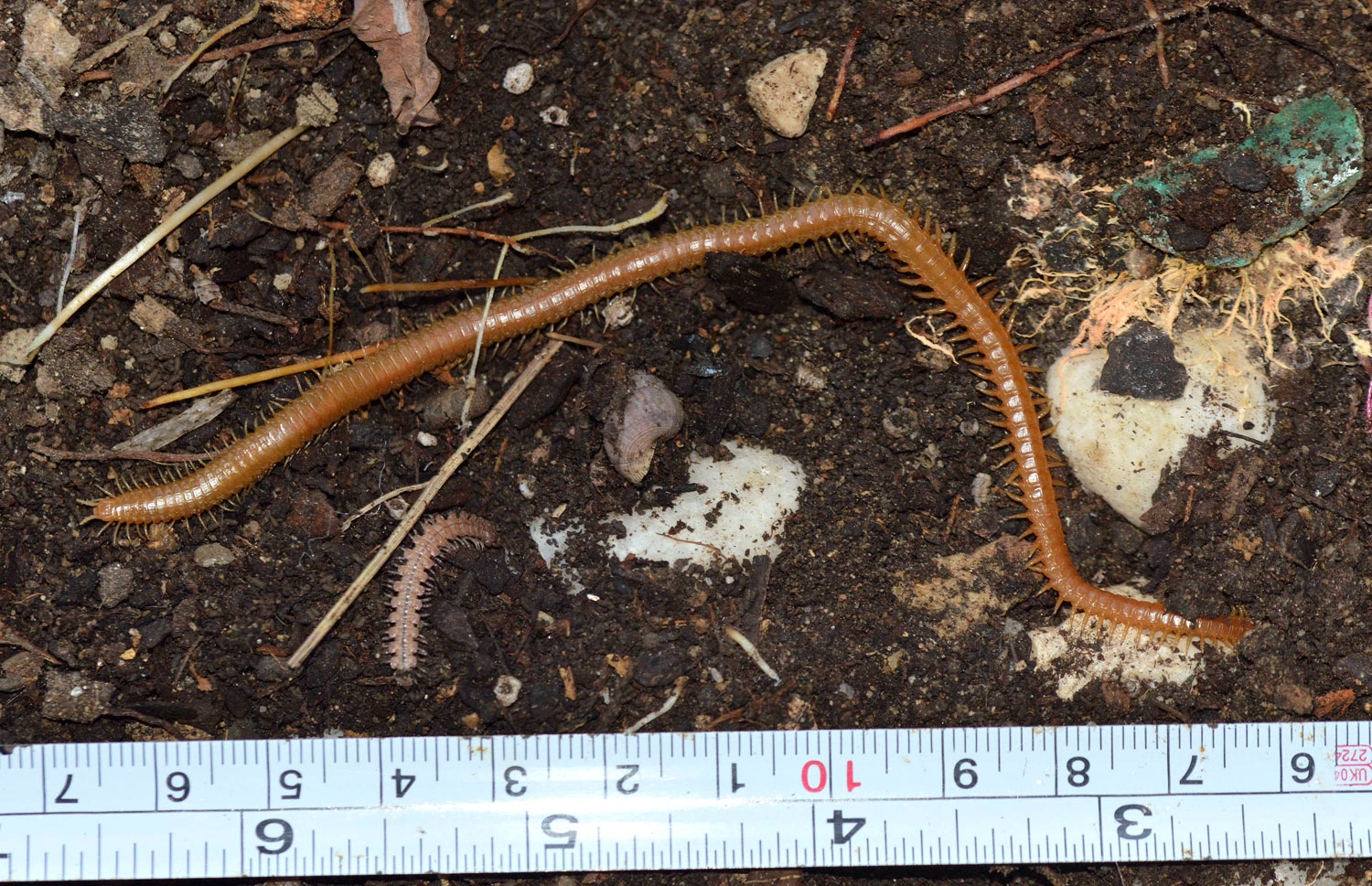 Las especies pertenecientes al orden Geophiloforma se caracterizan por su cuerpo estrecho y largo formado por muchos segmentos. Los del género Haplophilus son de los más largos. El ejemplar de las imágenes es de los grandes. Según he contado, tiene por lo menos 110 segmentos y 14 centímetros de largo. Según algunos manuales, la especie que abunda en las ciudades es Geophilus carpophagus que tiene una longitud máxima de 7 cm [1]. No recuerdo haber visto esta especie. Aunque lo cierto es que no es fácil la identificación. Y yo soy poco conocedor de los quilópodos.