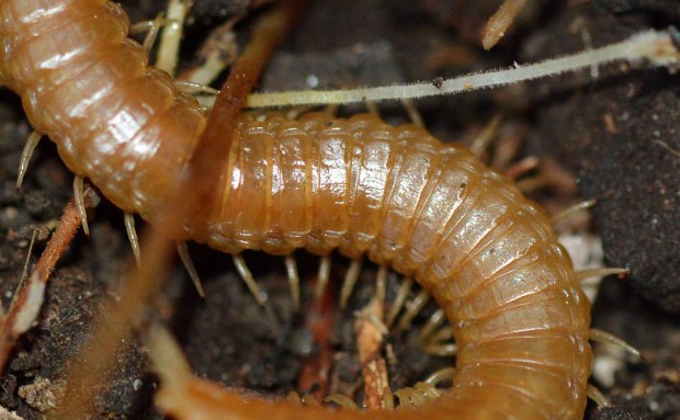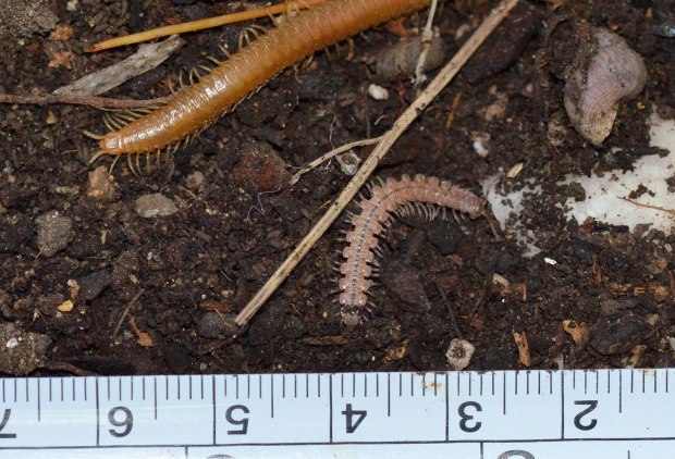 Resultan muy interesantes los miriápodos (Myriapoda). De la gran cantidad de especies que forman parte de este subphylum, unas pocas se han adaptado a la vida urbana. En esta parte de la Península Ibérica, tenemos dos ciempiés (Chilopoda) como son Lithobius piceus y Scutigera coleoptrata que se han acomodado a la vida en el interior de edificaciones. Las podemos encontrar en las zonas húmedas de las casas, preferentemente en sótanos y cámaras sanitarias. Abundan también en el alcantarillado donde encuentran las presas de las que se alimentan. Otras especies se instalan alrededor de las casas en áreas ajardinadas como es el caso del ciempiés del orden Geophilomorpha. En las imágenes se puede ver un ejemplar de Haplophilus (Himantariidae) que encontré en un jardín de Barcelona debajo de un ladrillo.