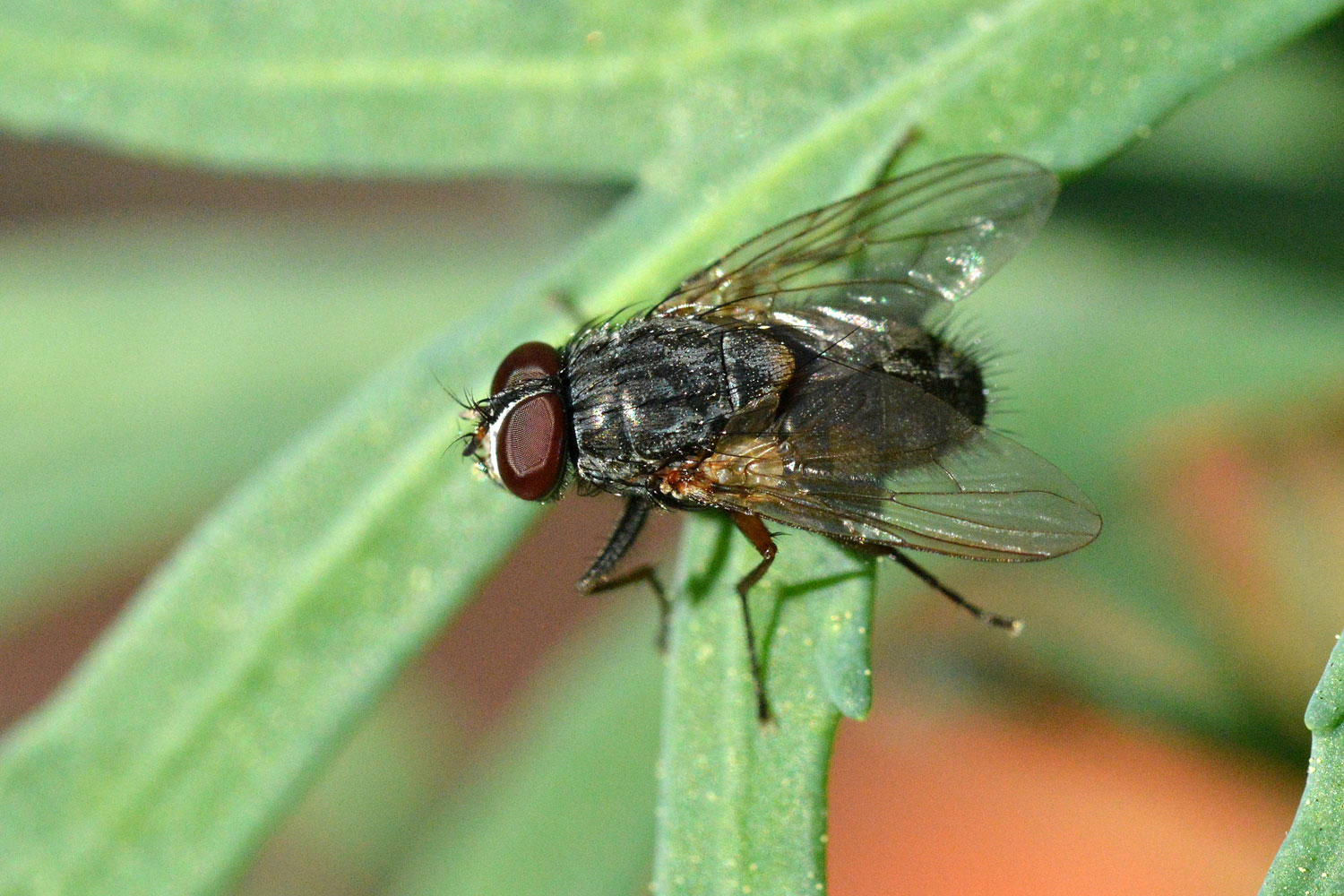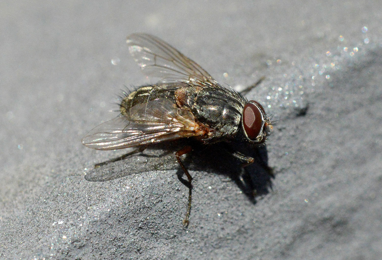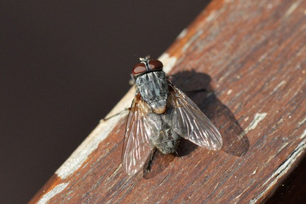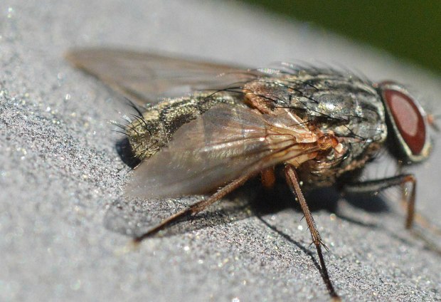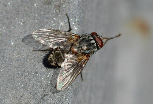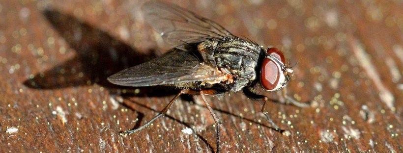 Una de las moscas más grandes que ronda por casas y sus alrededores es Muscina stabulans, conocida como mosca doméstica mayor. Es de mayor tamaño que la mosca doméstica (Musca domestica), entre 8 y 10 mm, y de aspecto más robusto. Su color grisáceo y las cuatro bandas negras sobre el tórax la delatan. Hace unos días estaba realizando una desratización en un jardín de Barcelona. Había congregadas un buen número de Muscina stabulans. Olía ligeramente a cadáver de rata de alcantarilla (Rattus norvegicus). Así que entendí que allí estaban buscando una oportunidad para su prole.