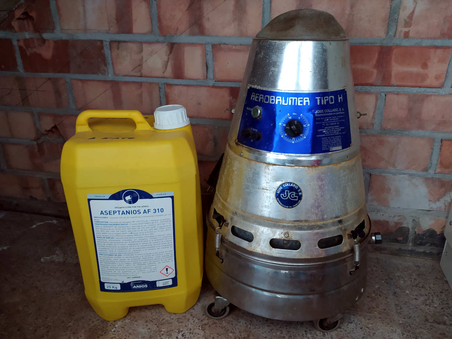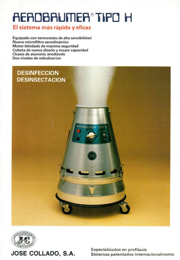 Dedico esta entrada a un aparato clásico de desinfección que lleva muchos años en el mercado. Se trata del Aerobrumer Tipo H fabricado por José Collado SA, empresa especialista en profilaxis que lleva en funcionamiento desde 1925 [1]. He visto el Aerobrumer Tipo H en empresas alimentarias y farmacéuticas. Hoy en día este aparato no se utiliza tanto como antaño. En las décadas de 1980 y 1990 su uso estaba muy extendido en toda la industria alimentaria. Era común su uso en sectores de explotación animal como la avicultura y la cunicultura. El aparato que en la actualidad se utiliza solo para desinfectar se utilizaba antaño también para crear letales nieblas insecticidas.