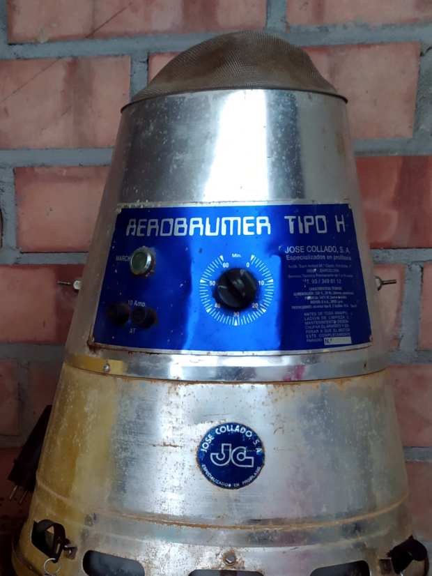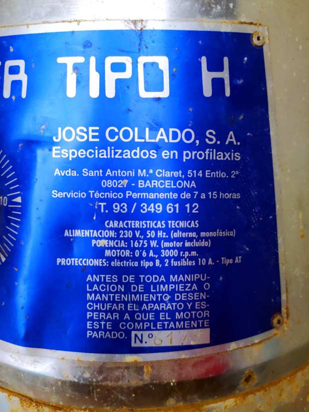 La primera vez que vi uno me pareció de diseño futurista. Me recordó a una copia en miniatura de la nave espacial Sputnik 2 que los rusos pusieron en órbita con la perrita Laika en su interior. Grosso modo, se han fabricado dos modelos. En las primeras imágenes de esta entrada (figuras 1 a 9) se puede ver fotografiado el segundo modelo, el más moderno. Es el llamado «Digital» por poseer un temporizador digital que controla el proceso de nebulización. La cubeta situada en la parte inferior donde se ubica el desinfectante tiene capacidad para 10 litros. Sin embargo, en el primer modelo el temporizador era mecánico y la cubeta tenía capacidad para 5 litros. Imágenes de este modelo se pueden ver en las figuras 10 y 11 donde he reproducido dos páginas de un folleto publicitario con fecha de 1984. Este primer modelo con temporizador mecánico debió de aparecer a principios de la década de 1970 [2]. Y el segundo, con temporizador digital, debió de apareció a finales de la década de 1990. Como se puede observar, es un aparato robusto fabricado en aluminio. Está diseñado para durar. Su mecanismo es sencillo y eficaz, lo cual garantiza muchos años de desinfecciones. Su mantenimiento se limita a la limpieza de la cubeta y los filtros. En la placa del panel de mandos aparece un dato interesante (figura 3). Junto al nombre del fabricante y características técnicas, hay un número de teléfono bajo la frase: «Servicio Técnico Permanente de 7 a 15 horas.» Este es un detalle que da cuenta de la profesionalidad de José Collado SA que da garantía a su uso. El Aerobrumer Tipo H mide cerca de 65 cm de alto por 45 cm de ancho.