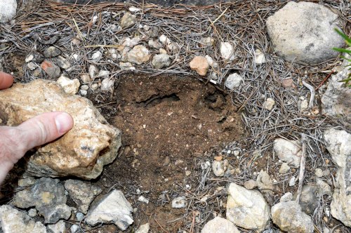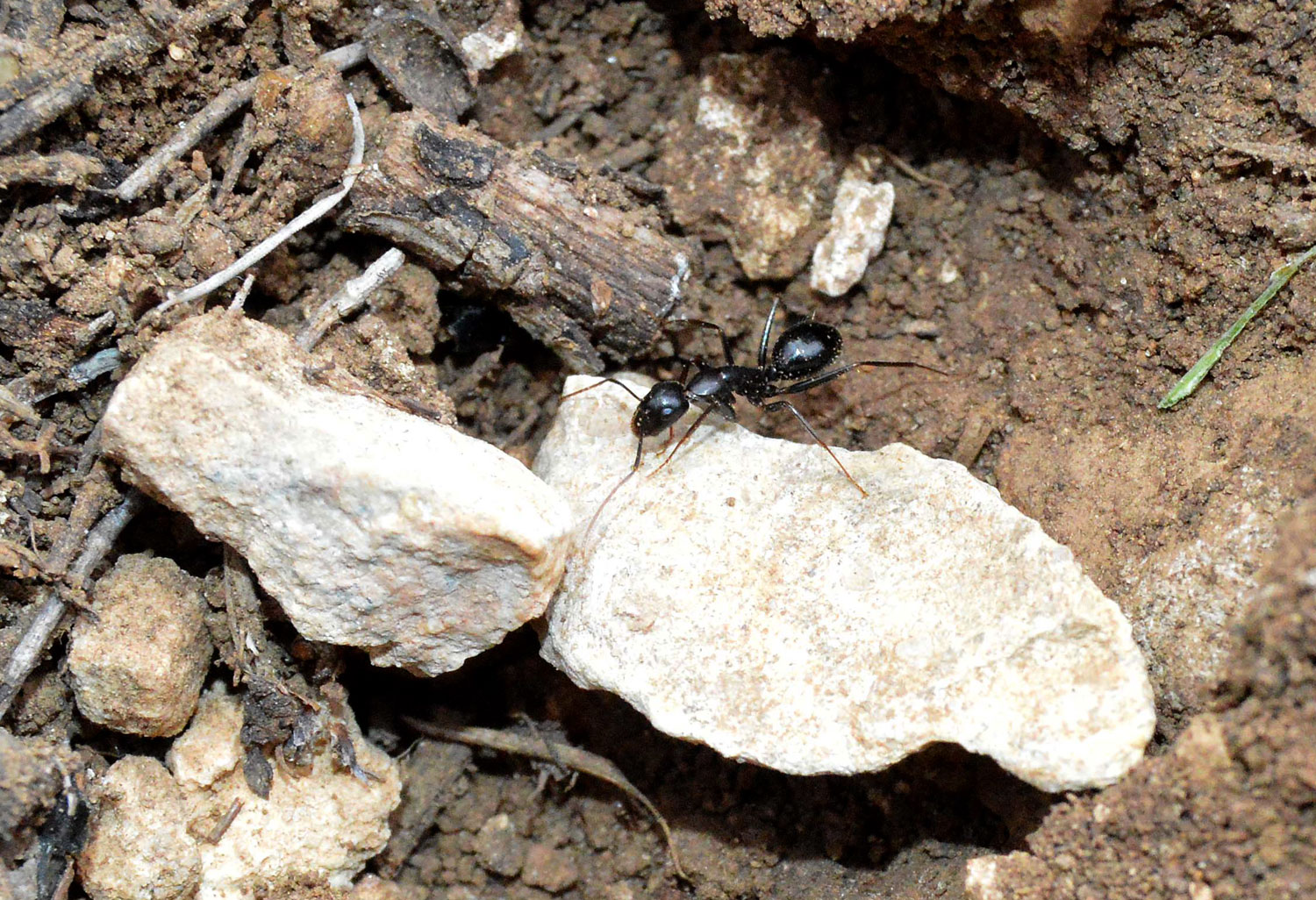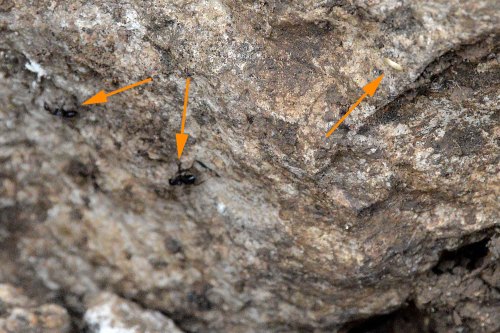 El pasado viernes 8 de diciembre estuve paseando por el macizo de Bonastre, en el Baix Penedès (Tarragona). Llegué a la cima más alta, sobre los 400 metros de altitud. Me paré un rato para disfrutar del paisaje y buscar hormigas. El cielo languidecía tras un cielo cubierto por nubes y la temperatura era de 11ºC. En consecuencia, las hormigas estaban refugiadas en su hormiguero. Así que me puse a levantar algunas piedras que tenía alrededor (figura 1). No fue una búsqueda sistemática. Tan solo un rato de observación. Encontré dos especies: Camponotus sylvaticus y Pheidole pallidula. Y también encontré algunos ejemplares de Proatelurina pseudolepisma asociados a la primera especie (figura 3). Apunto que bajo una piedra pude ver ambas especies de hormigas conviviendo muy juntas, lo cual no es obstáculo porque cada una tiene su comportamiento complementario. Pero no vi ningún zigentomo. Remarco que no fue una búsqueda sistemática. En la imagen número 4, se puede ver un poco la situación de los ejemplares que vi de P. pseudolepisma. Al levantar una piedra, encontraba uno agarrado en su parte inferior. La imagen es poco nítida, ya que el zigentomo descubierto corría rápido a esconderse. Mediante flechas indico la posición.