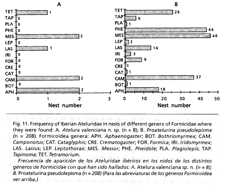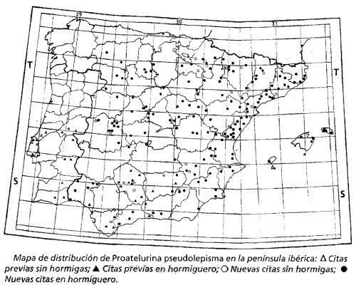 Encuentro muy interesante el artículo de Rafael Molero, un impresionante trabajo de recopilación de datos. Voy a destacar un mapa y una tabla que reproduzco en esta entrada. En primer lugar, en la figura 5 se puede ver un mapa de distribución de P. pseudolepisma. Como se puede observar, esta especie está distribuida prácticamente por toda la Península Ibérica e Islas Baleares. Esto indica lo abundante que es. Como ya he indicado, es fácil dar con un ejemplar en un nido de hormigas. En segundo lugar, en la figura 6 se puede ver una tabla de ambas especies de nicolétidos en relación con los géneros de hormigas a los que se ha encontrado asociados. Se trata de un resumen, ya que el artículo recoge todas las localizaciones reflejadas en los mapas de distribución y se puede leer a qué especie de hormiga estaba asociado el zigentomo. Respecto a P. pseudolepisma, se constata que se encuentra sobre los géneros más comunes a excepción de Crematogaster. Entiendo que si este nicolétido está asociado al suelo, se hace difícil que se pueda instalar en un hormiguero de Crematogaster scutellaris, especie que se instala en la corteza de los árboles o en la madera muerta como tocones. Destacan los géneros Messor, Pheidole, Camponotus y Tetramorium. Pero si tenemos en cuenta que del género Pheidole tan solo hay una especie nativa y en estado natural en la Península Ibérica, se puede afirmar que P. pseudolepisma se encuentra muy a gusto junto a Pheidole pallidula.
