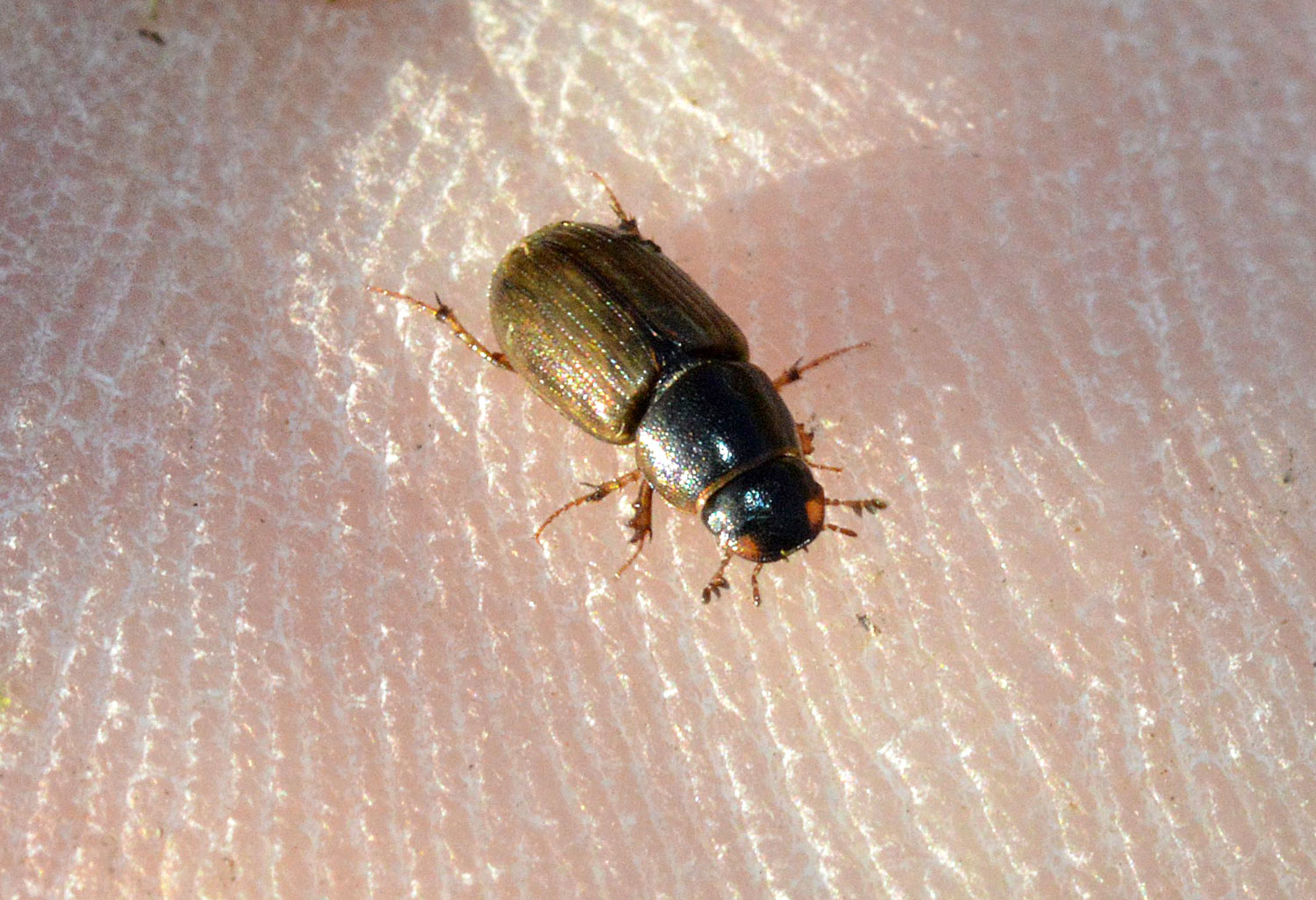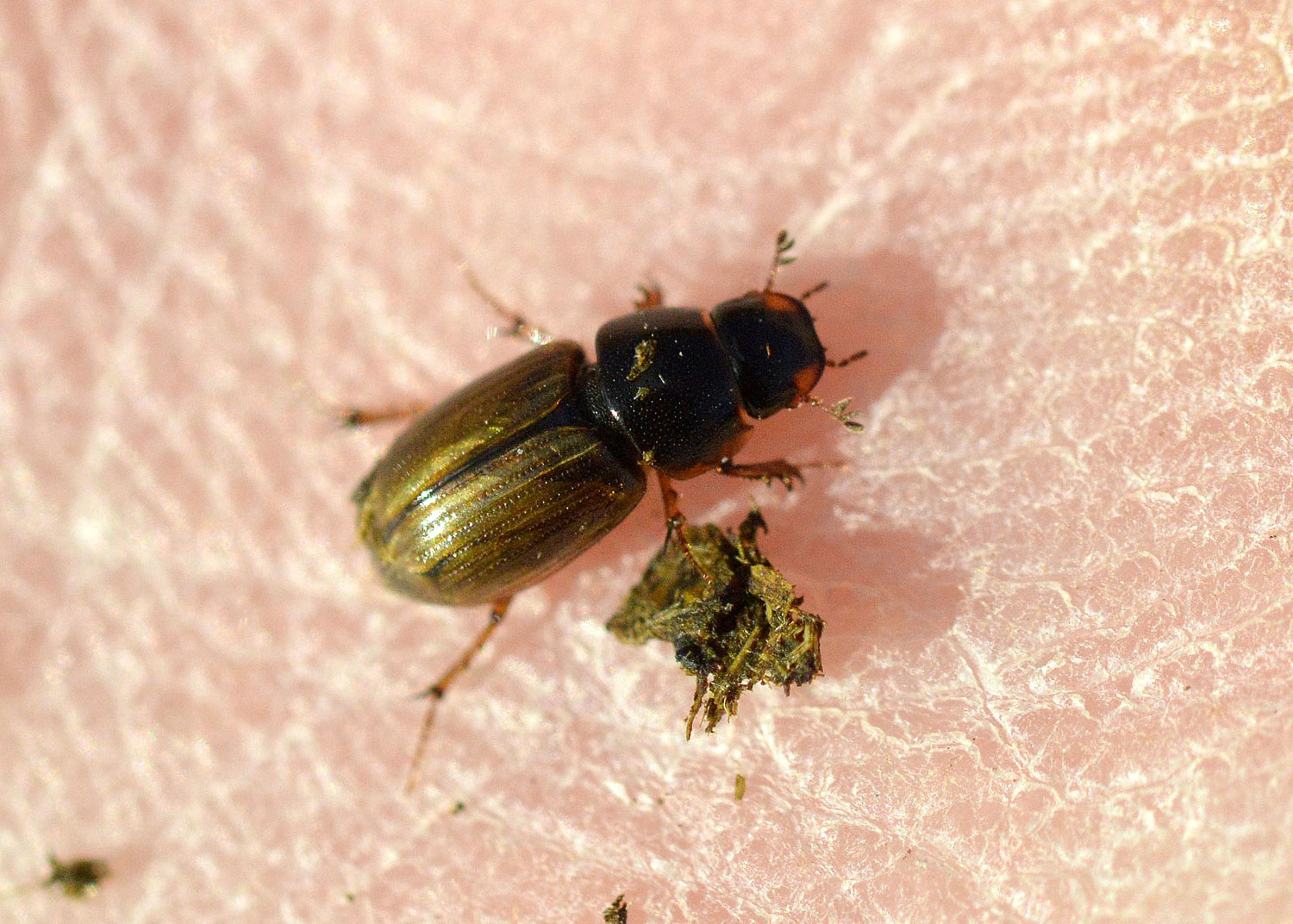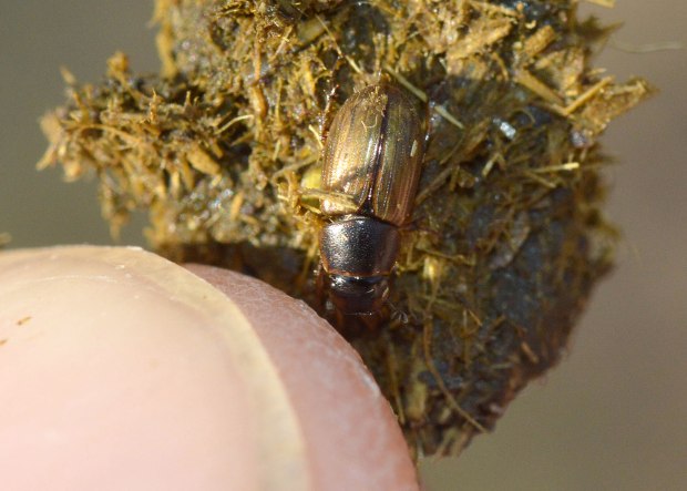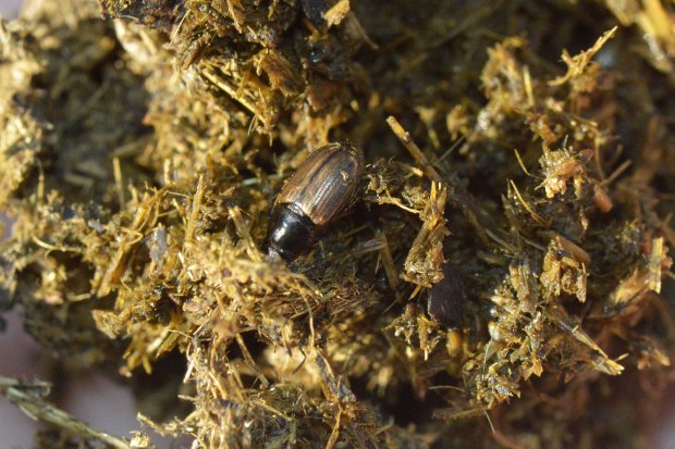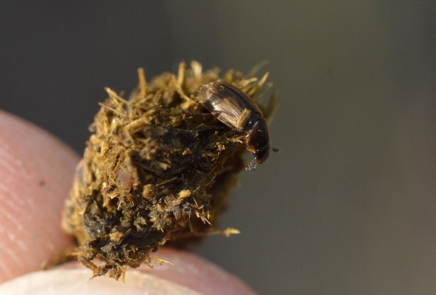 Lo que he encontrado son coleópteros del género Aphodius (Scarabaeidae). Este género está formado por un gran número de especies. De hecho, en la Península Ibérica pasa su número del centenar. Son escarabajos coprófagos que se alimentan y completan su ciclo en excrementos. Y es por ello que son clasificados como endocópridos. Término que permite separarlos de los telecópridos (rodadores) y de los paracópridos (enterradores). La hembra deposita los huevos sobre la superficie del excremento. La larva se desarrolla en su interior y pasa por tres estadios larvarios. Y cuando ha de pupar, la larva se queda en el excremento o se entierra en el suelo.