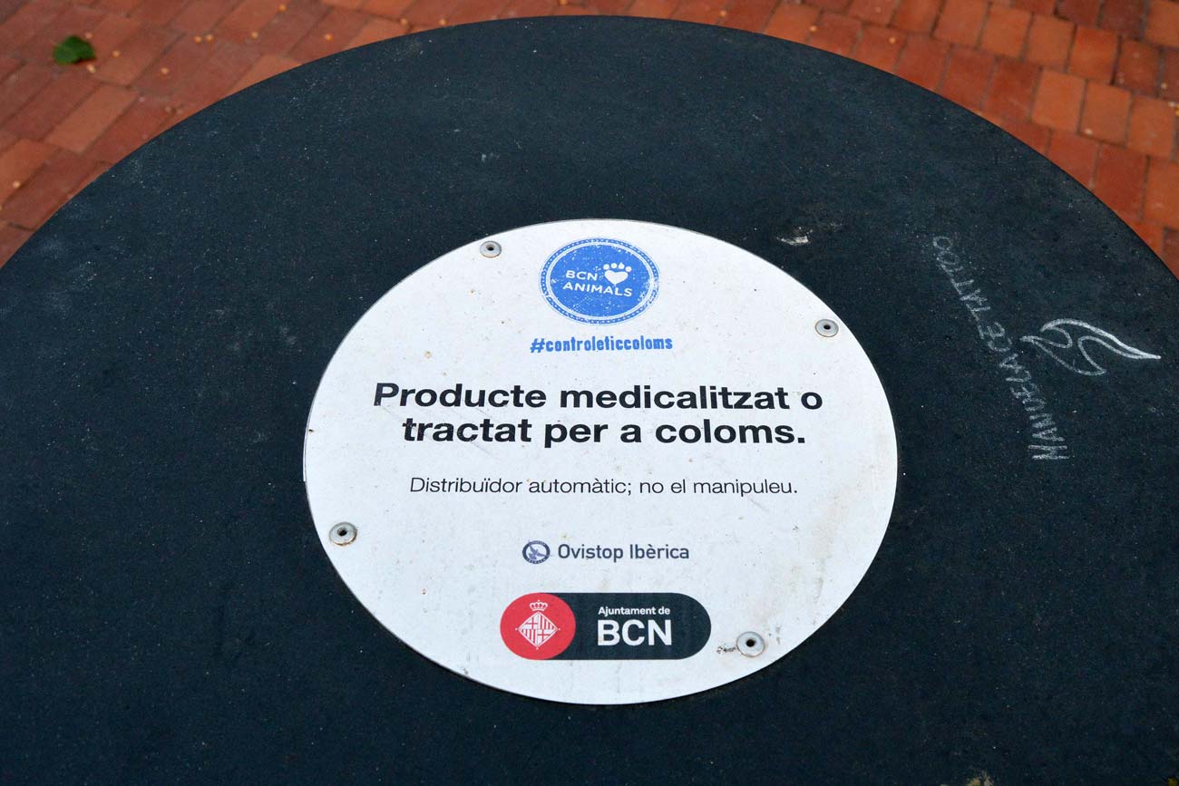 El culmen de todo este sinsentido se encuentra en la aplicación de Ovistop en Barcelona. Lo está aplicando el Área de Ecología, Urbanismo y Movilidad del Ayuntamiento de Barcelona. Los responsables de este área no saben ni lo que están aplicando ni están controlando si parte del cebo avicida va a parar a otras especies no diana o especies protegidas. Y todavía tienen menos idea de control poblacional ni de nada paraecido. Nos encontramos con el contrasentido de que los que tienen que defender unos valores ambientales de respeto al medio ambiente están justamente haciendo lo contrario. Ejemplo de que no saben que hacen es que, en los dispensadores de Ovistop de Barcelona, han escrito esto: «Producto medicalizado o tratado para palomas» (figura 8).