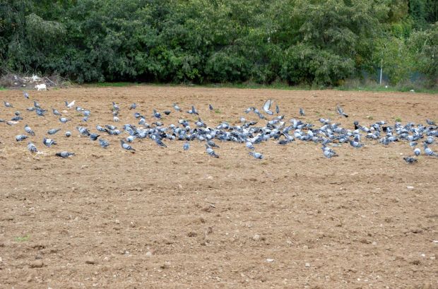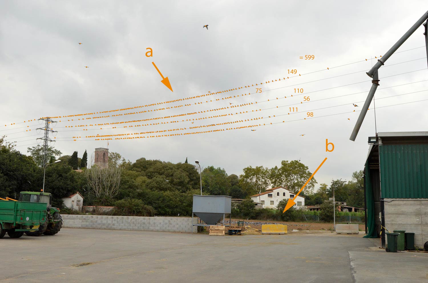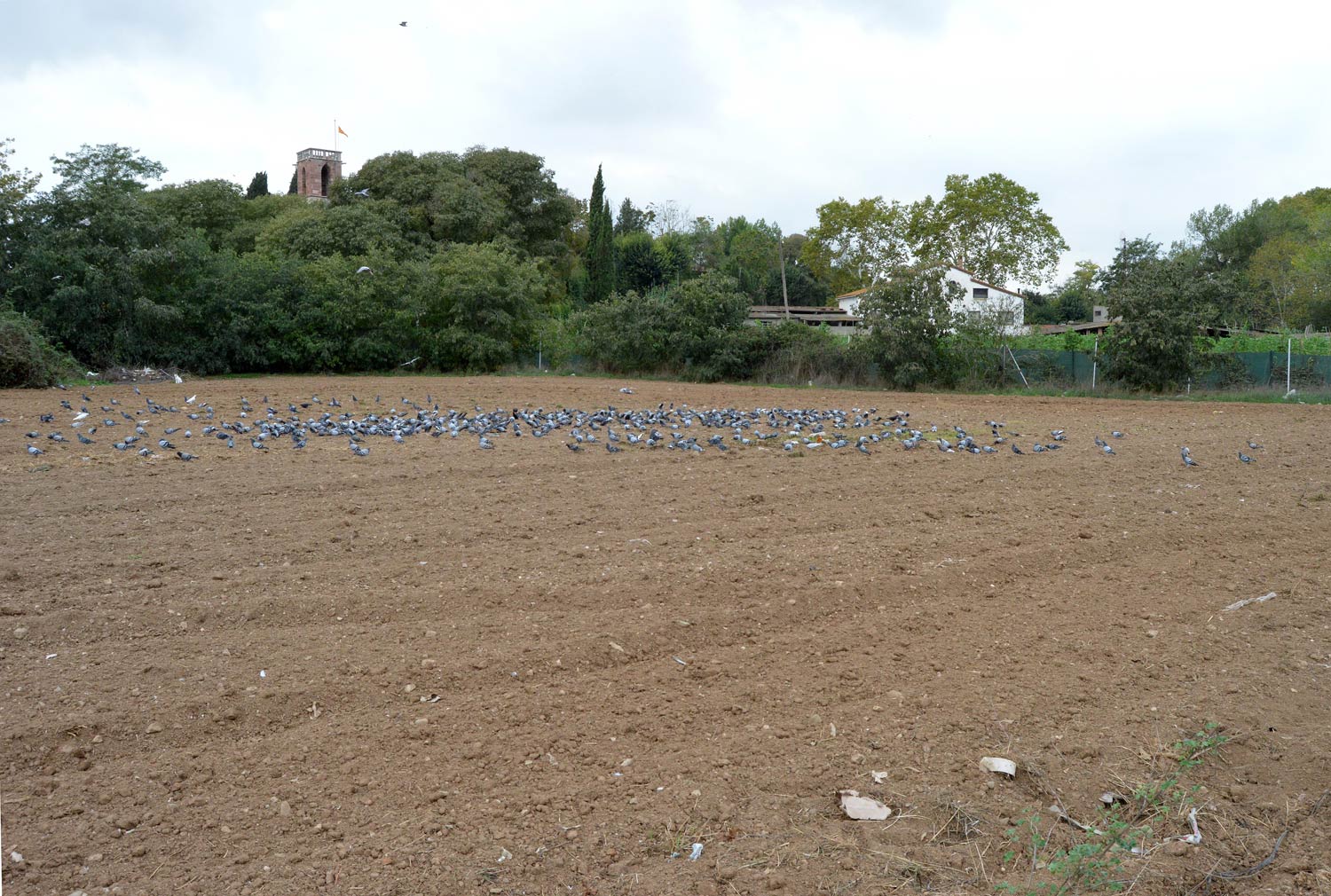 Tomé bastantes fotografías porque la situación era interesante y, sobre todo, muy plástica. Hoy he recuperado las fotografías que tenía guardadas en una carpeta y me he preguntado cuántas palomas debían haber. Me he basado en dos fotografías que tomé en un momento el que la mayor parte de palomas se encontraban en dos lugares: sobre el tendido eléctrico (figuras 13 a 17) y sobre el campo labrado que había justo debajo (figuras 18 a 20). En la imagen número 21, se puede ver el conteo realizado sobre las palomas del tendido eléctrico: 599 individuos. Y en la imagen 22, el conteo de las palomas situadas en el campo labrado: 426 individuos. Por tanto, había como mínimo una población de 1.025 palomas. Ahora bien, se podría añadir perfectamente otro centenar más, ya que había más individuos dispersos por otros lugares.