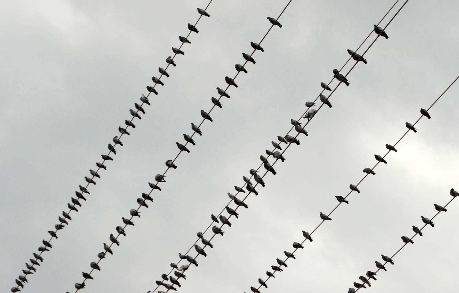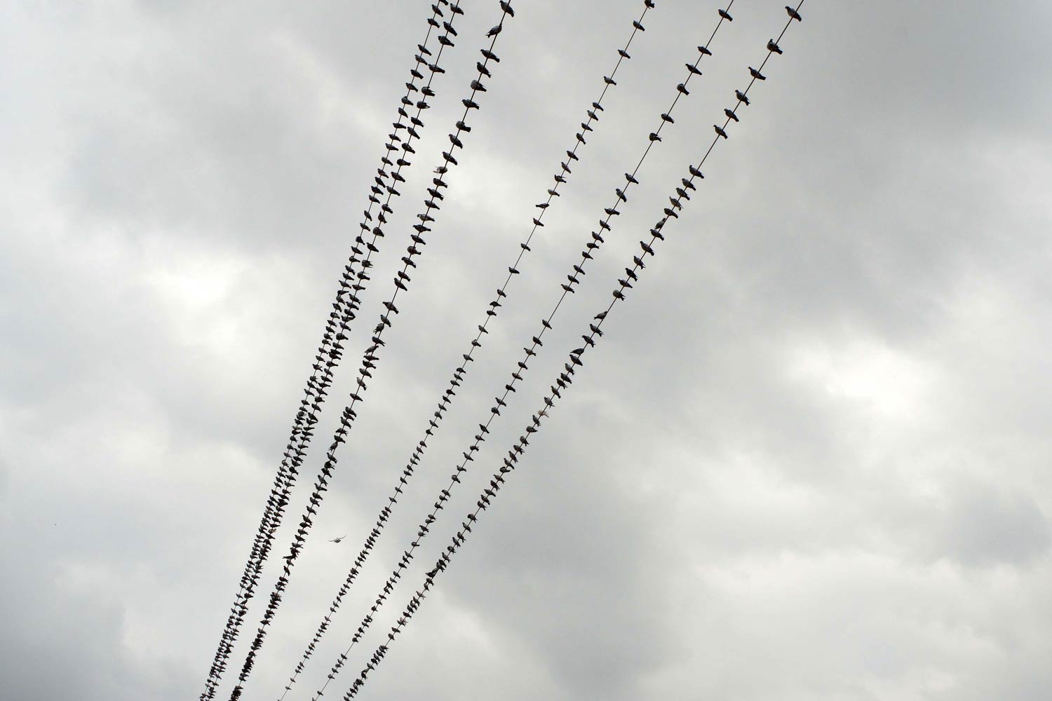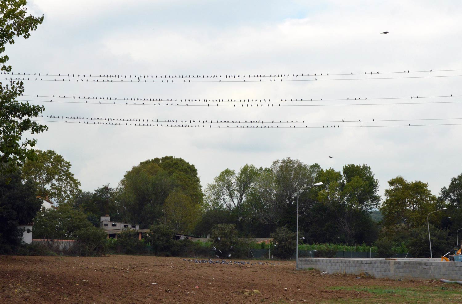 Tomé bastantes fotografías porque la situación era interesante y, sobre todo, muy plástica. Hoy he recuperado las fotografías que tenía guardadas en una carpeta y me he preguntado cuántas palomas debían haber. Me he basado en dos fotografías que tomé en un momento el que la mayor parte de palomas se encontraban en dos lugares: sobre el tendido eléctrico (figuras 13 a 17) y sobre el campo labrado que había justo debajo (figuras 18 a 20). En la imagen número 21, se puede ver el conteo realizado sobre las palomas del tendido eléctrico: 599 individuos. Y en la imagen 22, el conteo de las palomas situadas en el campo labrado: 426 individuos. Por tanto, había como mínimo una población de 1.025 palomas. Ahora bien, se podría añadir perfectamente otro centenar más, ya que había más individuos dispersos por otros lugares.