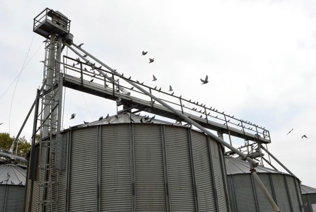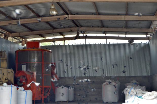 Fig 1. Paloma doméstica en las instalaciones de almacenamiento de grano y pienso de la agrotienda La Perpetuenca (Santa Perpètua de Mogoda)./ C. Pradera 10-2017
