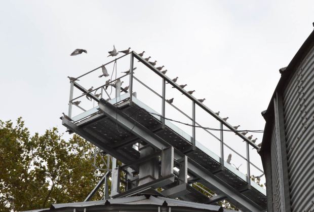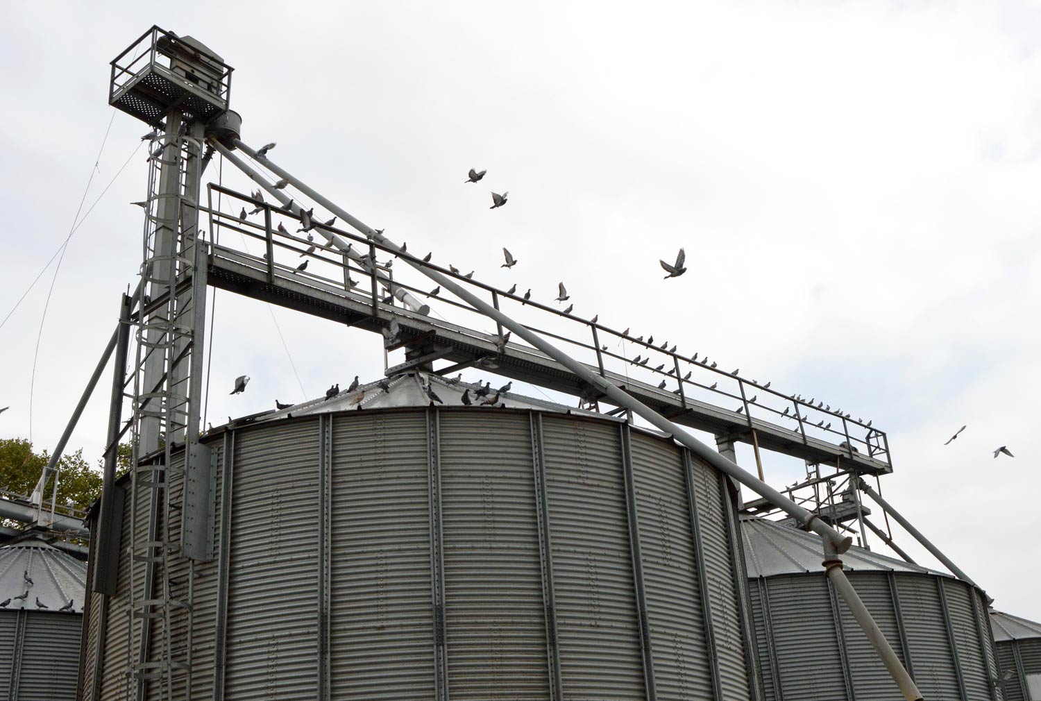También he realizado un conteo de tórtola doméstica. En la imagen 23 se puede ver un buen número de tórtolas sobre los silos. Teniendo en cuenta los individuos que aparecen visibles, he contado 155. Por supuesto, se podría añadir cincuenta ejemplares más ocultos en la fotografía o fuera de esta. En resumen, una buena bandada de palomas y tórtolas. Se trata de un problema no fácil de solucionar que hemos generado las propias personas.