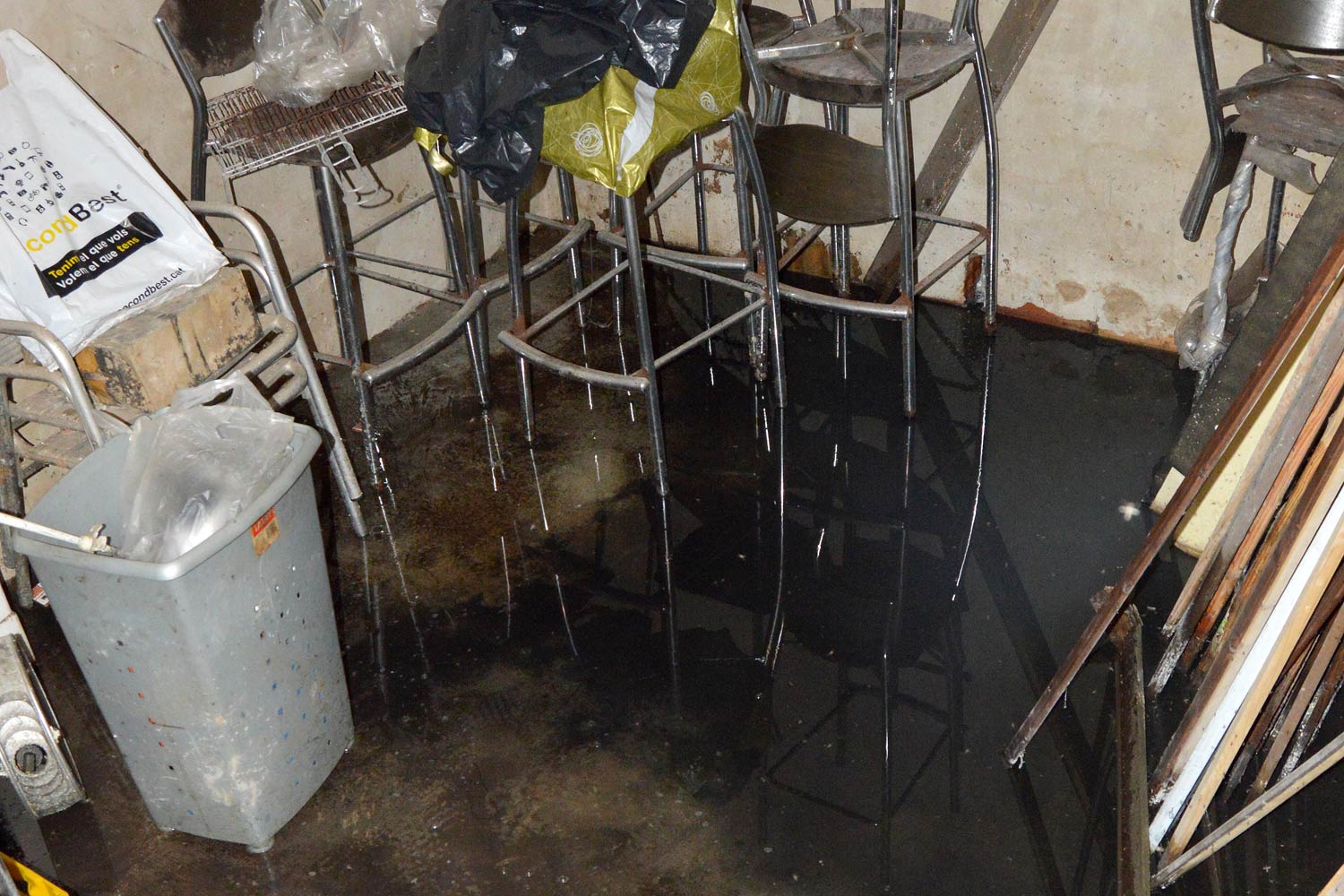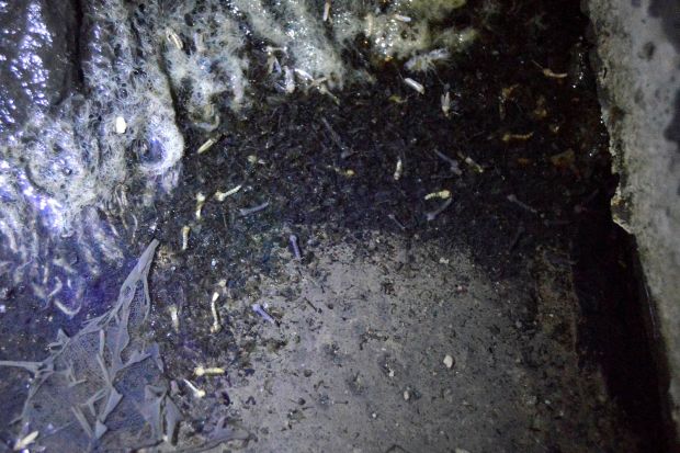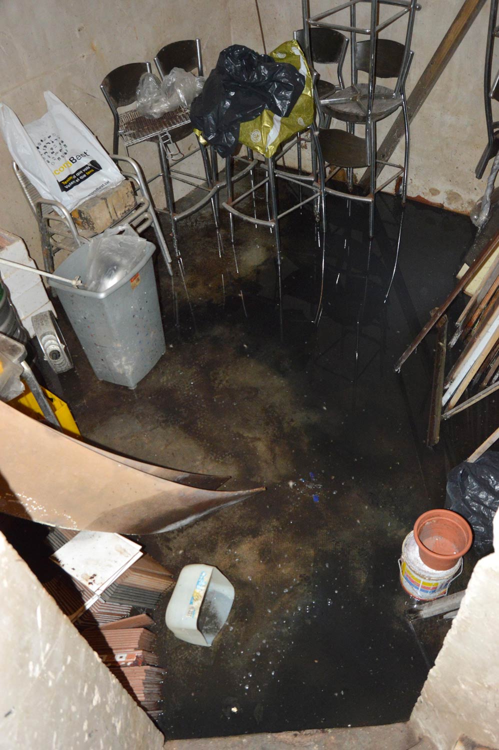 El propietario nos dijo que hacía tiempo que padecían el problema. Le explicamos que las larvas de mosquito necesitaban agua acumulada su desarrollo. Y que el mosquito común se las apañaba muy bien con aguas sucias [1]. Teniendo en cuenta la información recabada, entendimos que la acumulación de agua debía ser grande. Quizás hubiera en el edificio alguna cisterna, fosa séptica o depósito que fuera el origen del problema. Nos comentó que había un sótano al que bajaba muy de vez en cuando. Entonces le pedimos que nos dejara mirar. El acceso se encontraba en el suelo del almacén a través de una trampilla de madera.