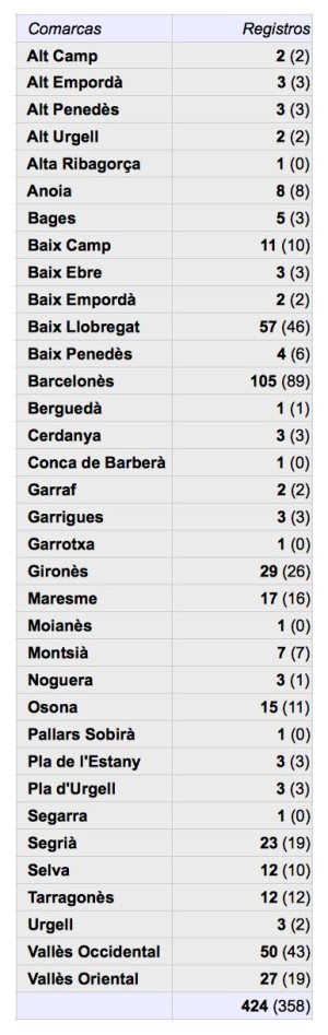 En la figura número 5, muestro un mapa de registros por comarcas. Se ve claro el peso económico y demográfico que tiene cada comarca. Si la provincia de Barcelona ostenta el mayor número de registros, las comarcas que forman el área metropolitana de Barcelona se llevan la palma. Estas son el Barcelonès, el Baix Llobregat, el Vallès Occidental, el Valles Oriental y el Maresme. También destacan, en menor medida, las comarcas de las otras capitales. En la figura número 6, se pueden ver un mapa con los registros por municipios del área metropolitana Barcelona.