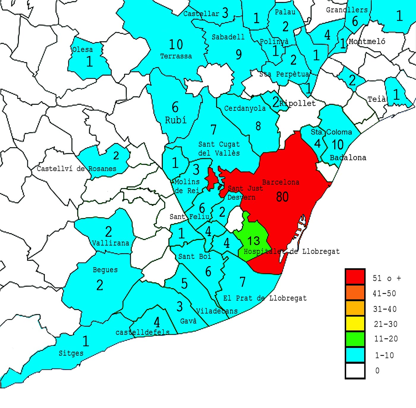 En la figura número 5, muestro un mapa de registros por comarcas. Se ve claro el peso económico y demográfico que tiene cada comarca. Si la provincia de Barcelona ostenta el mayor número de registros, las comarcas que forman el área metropolitana de Barcelona se llevan la palma. Estas son el Barcelonès, el Baix Llobregat, el Vallès Occidental, el Valles Oriental y el Maresme. También destacan, en menor medida, las comarcas de las otras capitales. En la figura número 6, se pueden ver un mapa con los registros por municipios del área metropolitana Barcelona.