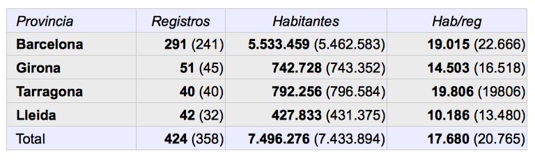 En la figura número 3, se puede ver una tabla en la que se muestran los registros del ROESP por provincias. Y la figura número 4, muestro los registros para las capitales de provincia. Lógicamente el número de registros de la provincia de Barcelona es mayor. Son 291, lo que representa el 67%. Y dentro de esta provincia, la ciudad de Barcelona es la que ostenta más registros (80). Esto es reflejo de su peso demográfico y económico. En ambas tablas aparecen datos sobre población. Las cifras en negrita pertenecen al censo de 2017. Y entre paréntesis, el censo de 2014.