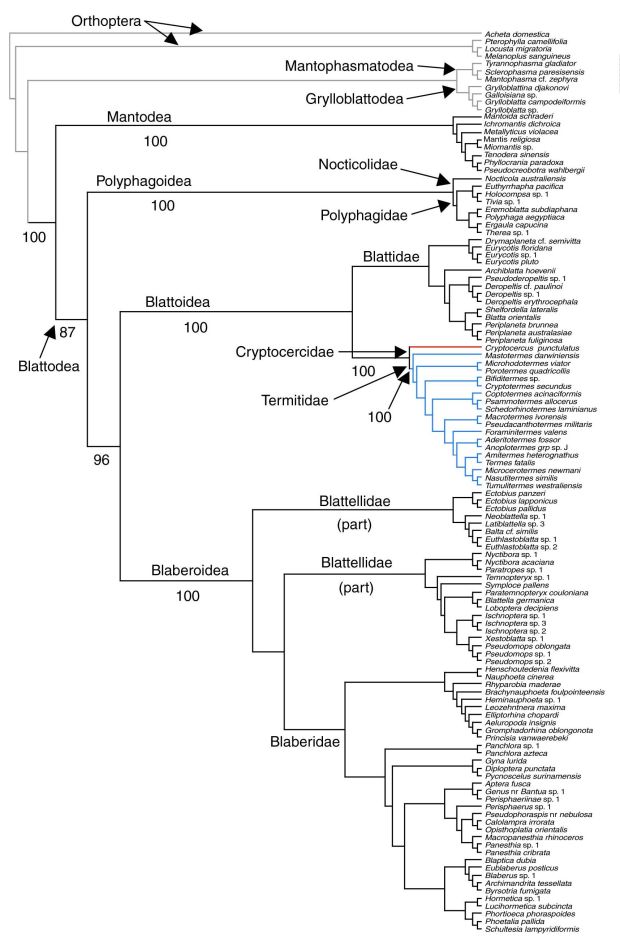 [3] Daegan Inward, George Beccaloni & Paul Eggleton. 2007. Death of an order: a comprehensive molecular phylogenetic study confirms that termites are eusocial cockroaches. Biology Letters, The Royal Society, No. 3, pp. 331–335.