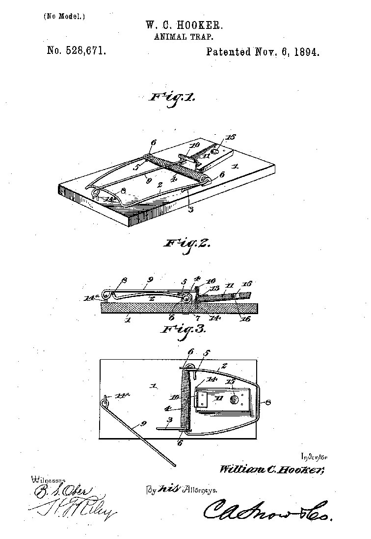 [2] W.C. Hooker. 1894. ANIMAL TRAP. USA. No. 528,671. Patented Nov, 6, 1894.