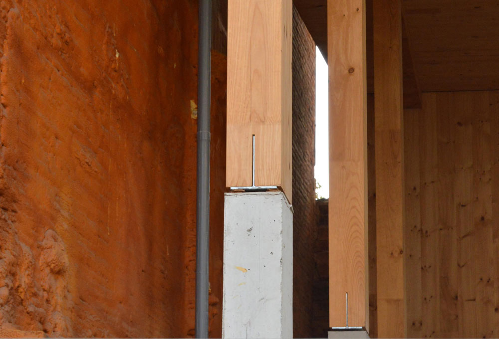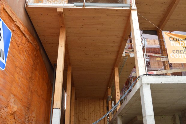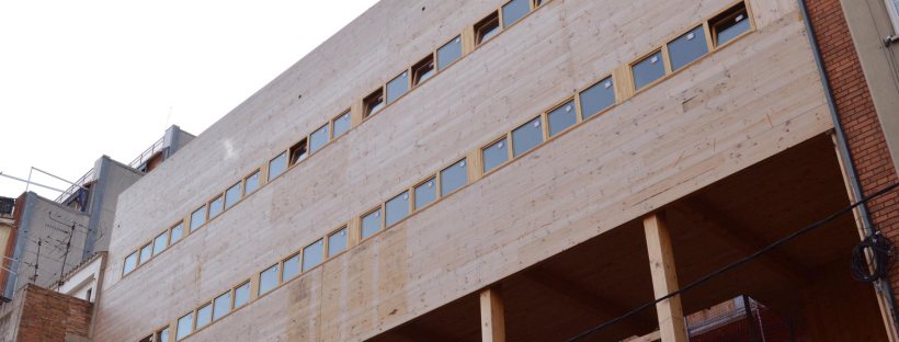 El edificio se ha construido sobre un solar que pertenecía al antiguo recinto industrial de Can Batlló. El suelo es de titularidad pública y ha sido cedido por el Ayuntamiento de Barcelona para los próximos 75 años. Se ha buscado que el edificio sea sostenible, ecológico y asequible y cuente con la máxima calificación energética. Y para ello, nada mejor que el uso de madera como elemento estructural. Sin embargo, no está totalmente construido en madera. La cimentación y el forjado de la planta baja está hecho de hormigón armado. Esta es la tendencia que se está siguiendo en la construcción de este tipo de edificios. De esta manera, se consigue un buen aislamiento de la madera del suelo. Y por supuesto, eliminar el ataque de los hongos de pudrición y de las termitas subterráneas.