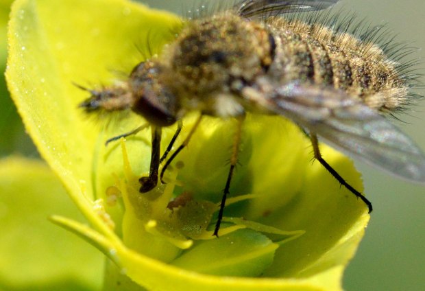 Hace unos días, tuve la oportunidad de ver una buena cantidad de ejemplares de Conophorus virescens en la playa de Montgat (Barcelona), en una zona donde crece libres las plantas. Los encontré libando el néctar de las abundantes flores que había. De hecho, siempre que he fotografiado bombílidos ha sido sobre flores. Son activos libadores que ayudan en la polinización. Algunas especies, como las del género Bombylius, tienen una probóscide larga y fina que les permite libar de flores largas y estrechas [1].