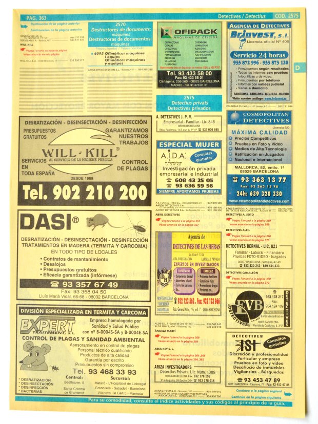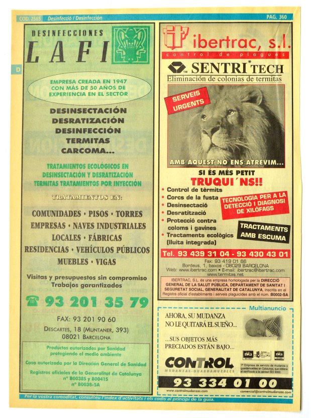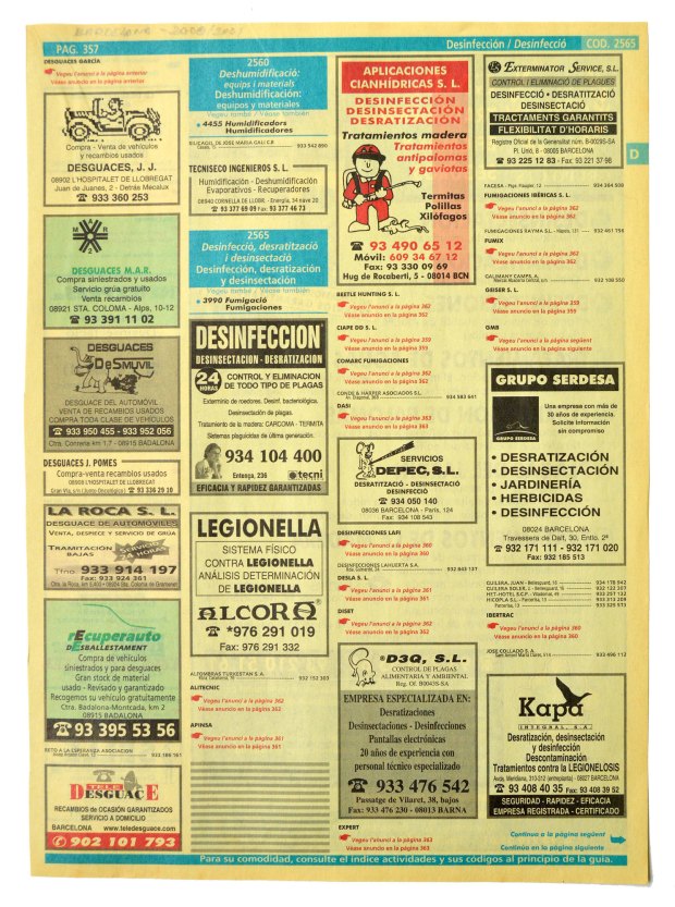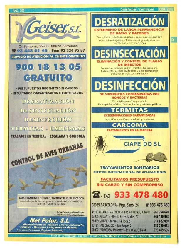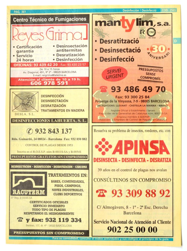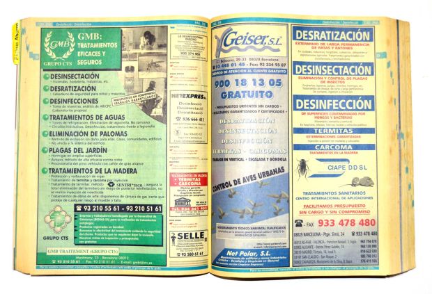 Encontré un ejemplar de la edición 2000-01 de las Páginas Amarillas para la ciudad de Barcelona. Lo abrí y busqué la sección dedicada a control de plagas. Interesante contenido. Han pasado 18 años. Muchas de las empresas que se anuncian en sus páginas siguen hoy en activo. Otras han desaparecido por cierre de negocio (las menos) o porque han sido absorbidas por otras empresas (las más).