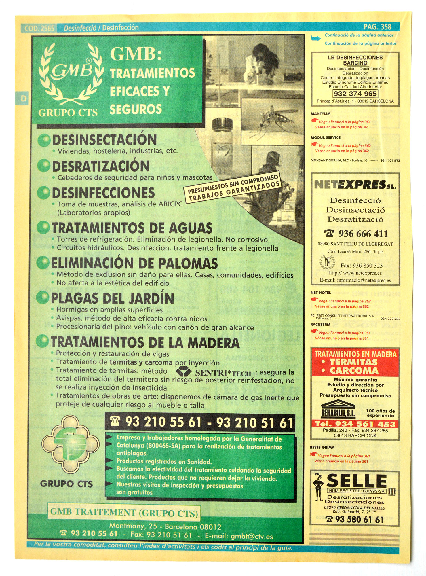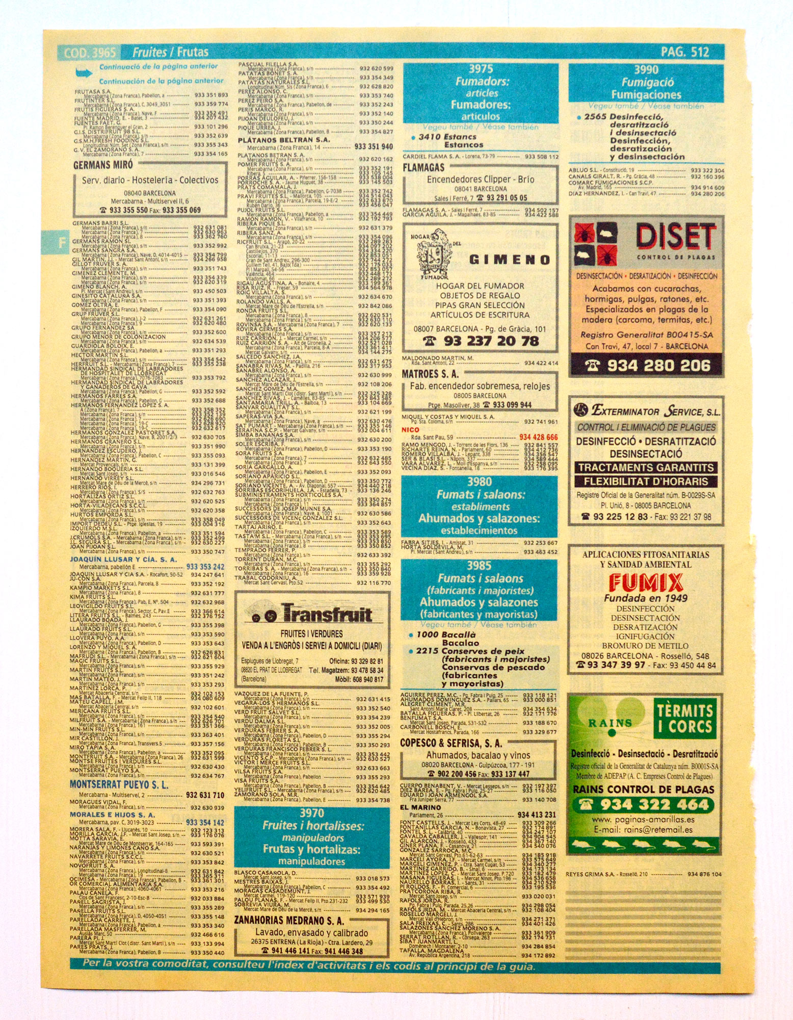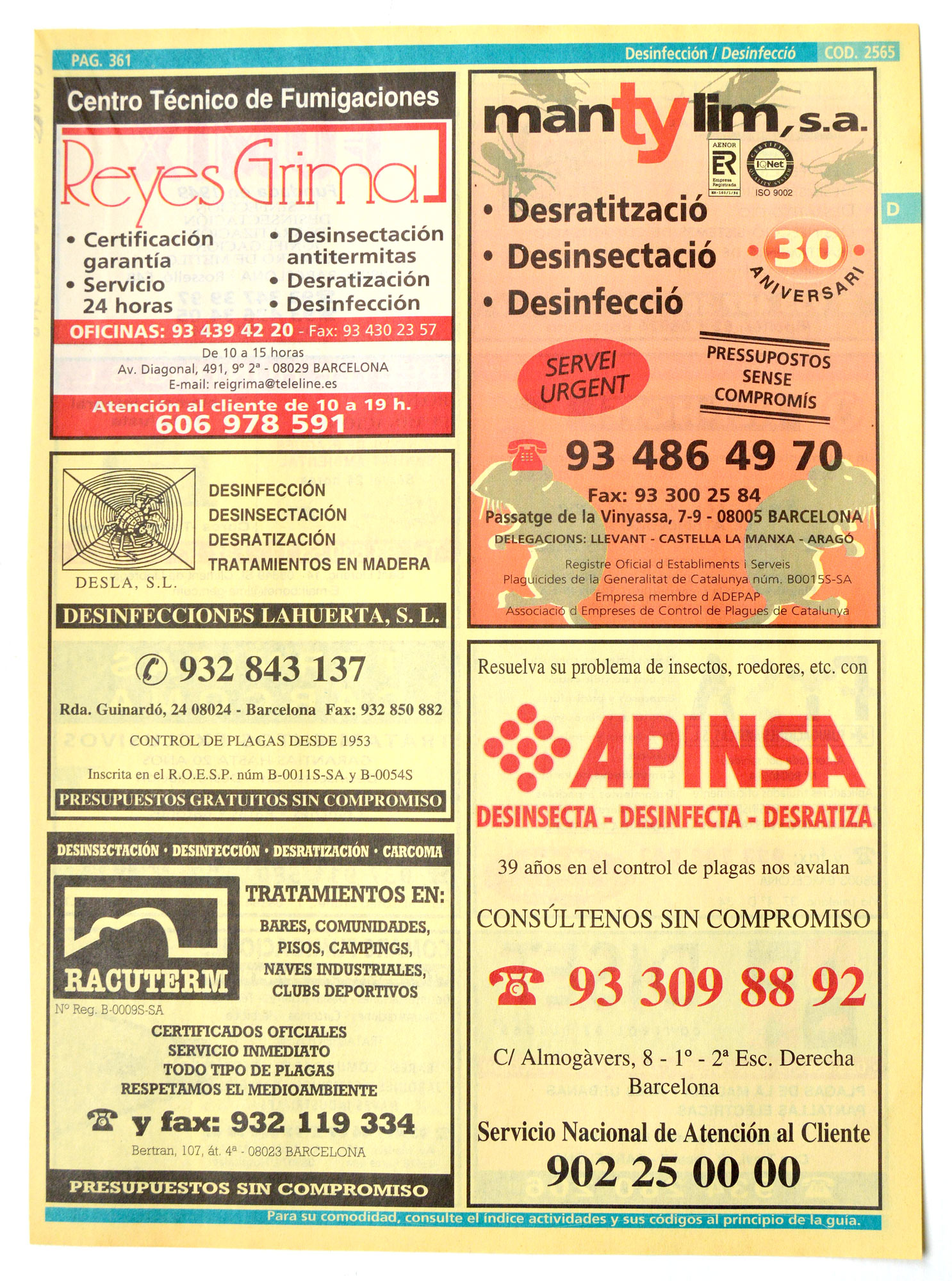 Encontré un ejemplar de la edición 2000-01 de las Páginas Amarillas para la ciudad de Barcelona. Lo abrí y busqué la sección dedicada a control de plagas. Interesante contenido. Han pasado 18 años. Muchas de las empresas que se anuncian en sus páginas siguen hoy en activo. Otras han desaparecido por cierre de negocio (las menos) o porque han sido absorbidas por otras empresas (las más).