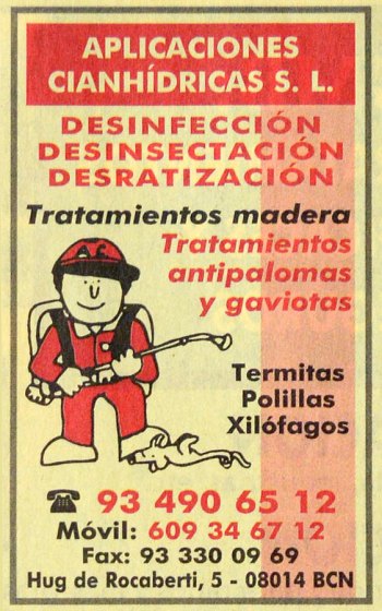 Los anuncios son variados. Algunos tan solo constan de una línea con el nombre de la empresa, dirección y teléfono. Y otros ocupan un espacio, mayor o menor, donde cabe mayor texto, dibujos y fotografías (infografía). Destaco el anuncio de Aplicaciones Cianhídricas (figura 2). Como ya he apuntado en alguna entrada anterior es la empresa más antigua en activo cuyo inicio de actividades es de 1930. El anuncio que ocupa mayor espacio es de GMB Traitement (figura 4), que justo en aquellos años fue troceada y vendida su cartera de clientes. Otro anuncio interesante es el de Desinfecciones Lafi (figura 6), la empresa más antigua y en activo de Cataluña creada en 1947. Y junto al anuncio de Lafi, se encuentra el de Ibertrac, que hace uso de una broma para atraer la atención de un posible cliente. Y en último lugar, destaco el anuncio de Reyes Grima (figura 7). Esta empresa era lo que quedaba de la prestigiosa Casa Grima, la primera y gran empresa dedicada a la sanidad ambiental en España. Reyes Grima fue decreciendo hasta que fue vendida lo que quedaba a ISS cuando estaba en plena expansión. Para finalizar, apunto el nombre de otras empresas históricas como Fumix, Will-Kill, J.J. Sendra Vellvé (SEDYF), Serdesa, Apinsa, Fumigaciones Ibéricas, Desinfecciones Lahuerta, Juan Guilera Soler (Radan Desintec), etc.