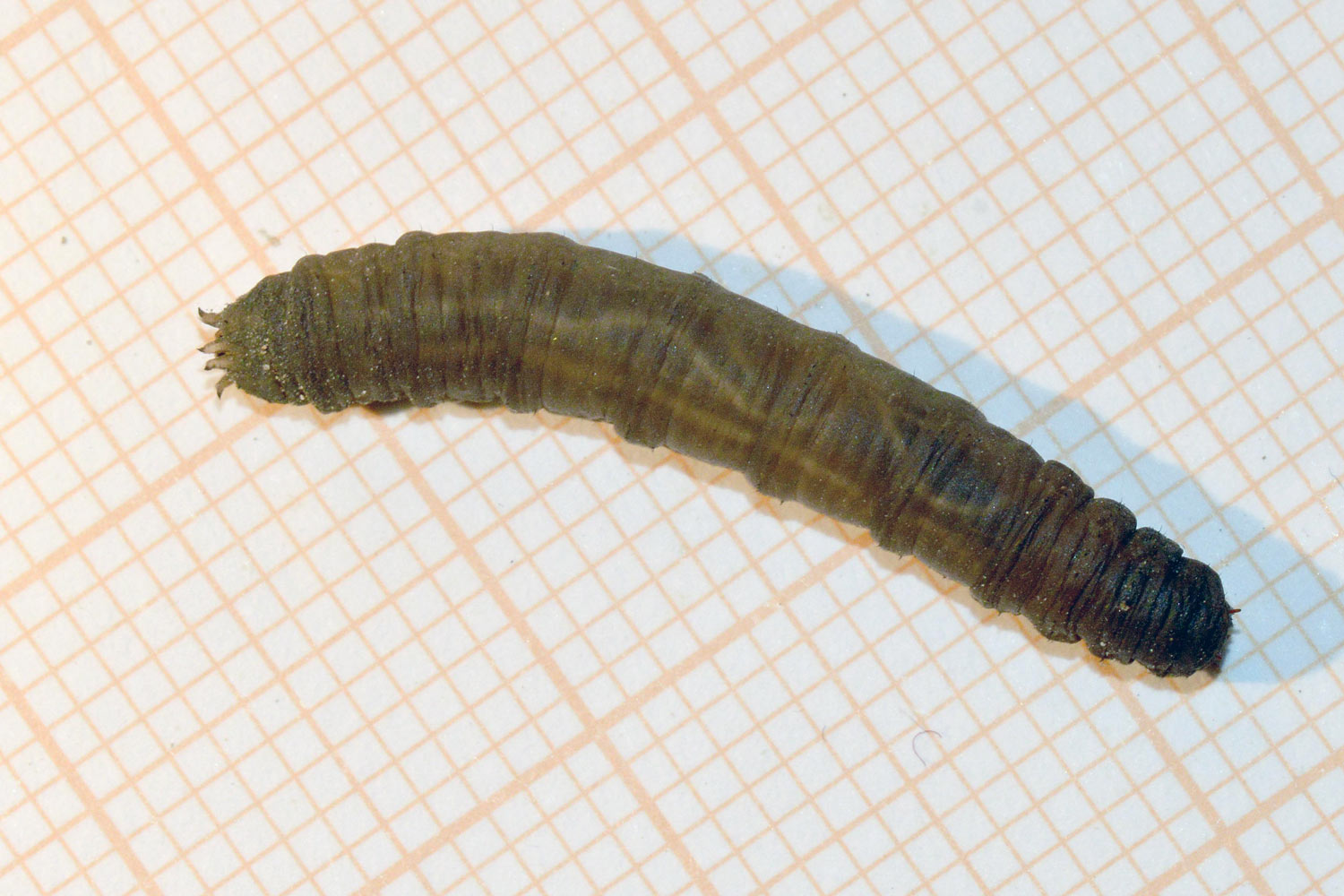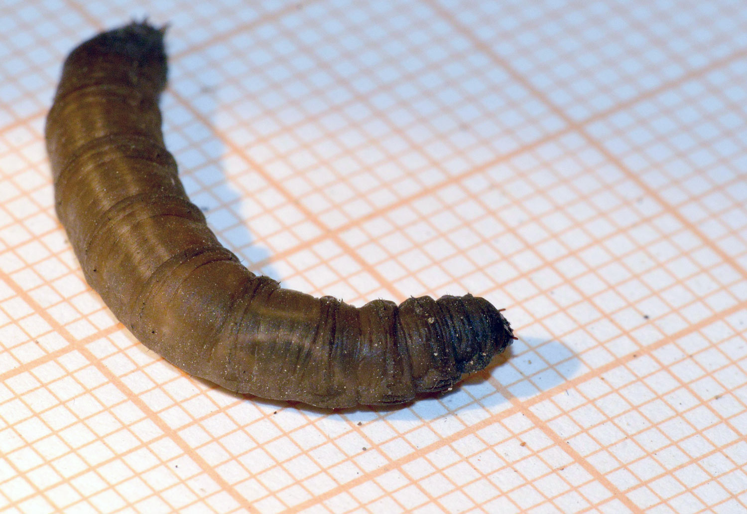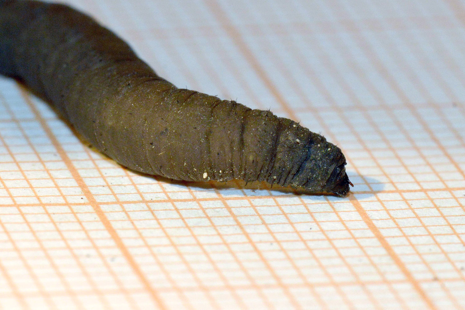 Hoy he vuelto a la zona y he buscado si había más larvas. Y en efecto, he encontrado una docena que parecían estar muy bien en el suelo húmedo (figura 2). Las abundantes lluvias de este año habrá facilitado su reproducción. Estaban escondidas debajo de papeles y plásticos. He recogido cinco para observarlas en casa y tomar fotografías de detalle (figura 4). Tanto las que recogí en enero como hoy, diría que pertenecen todas a una misma especie. En la península Ibérica había constatadas 143 especies en 2002 [1]. A este número, habrá que añadir los tipúlidos exóticos que han ido llegando como Nephrotoma ferruginea, especie que pude fotografiar el año pasado en Utxesa, Torres de Segre, Lleida [2].