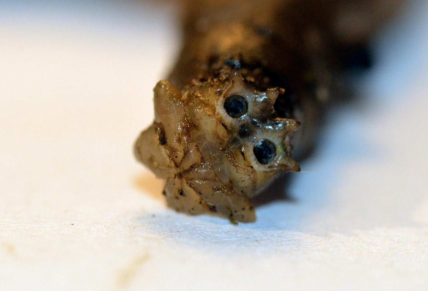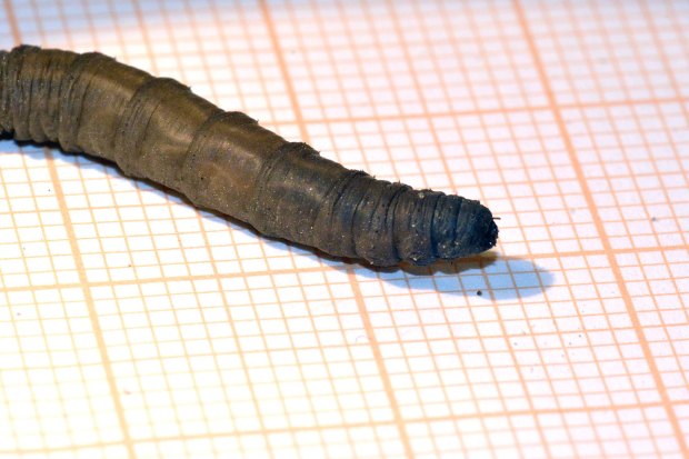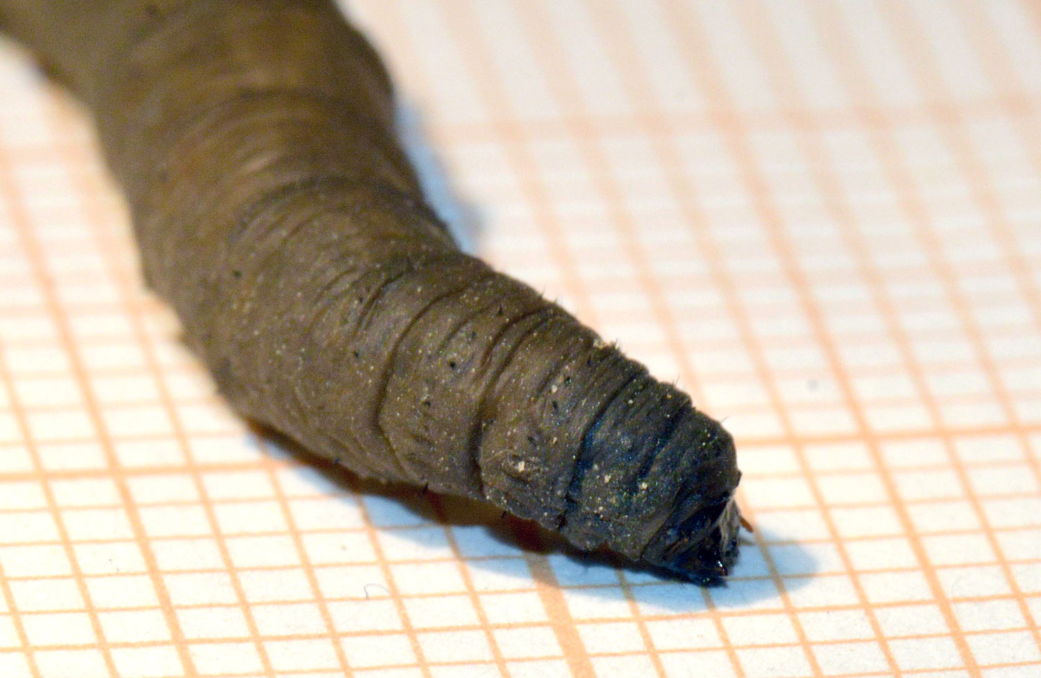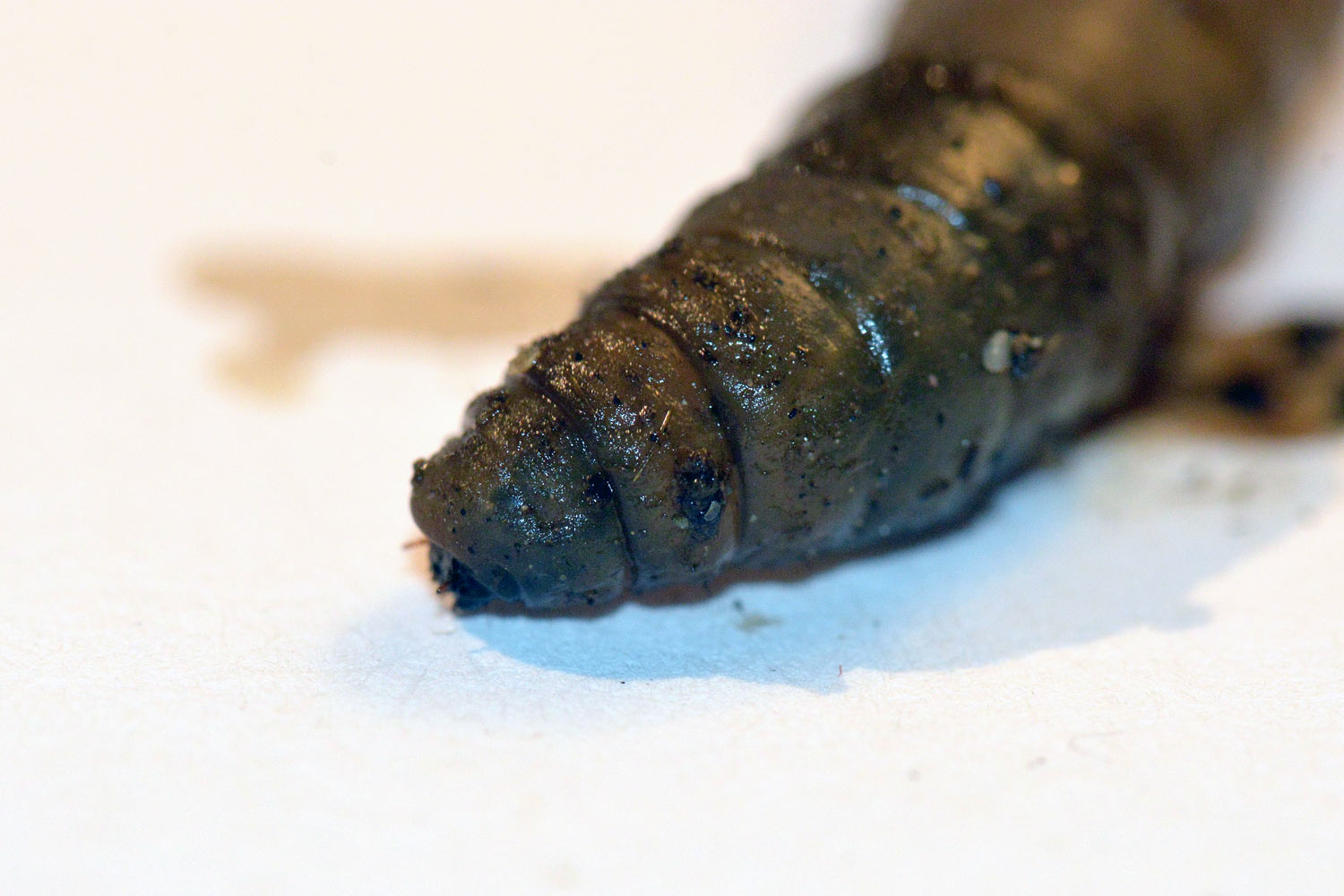 Hoy he vuelto a la zona y he buscado si había más larvas. Y en efecto, he encontrado una docena que parecían estar muy bien en el suelo húmedo (figura 2). Las abundantes lluvias de este año habrá facilitado su reproducción. Estaban escondidas debajo de papeles y plásticos. He recogido cinco para observarlas en casa y tomar fotografías de detalle (figura 4). Tanto las que recogí en enero como hoy, diría que pertenecen todas a una misma especie. En la península Ibérica había constatadas 143 especies en 2002 [1]. A este número, habrá que añadir los tipúlidos exóticos que han ido llegando como Nephrotoma ferruginea, especie que pude fotografiar el año pasado en Utxesa, Torres de Segre, Lleida [2].