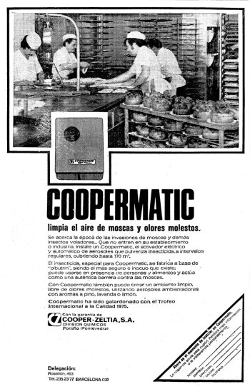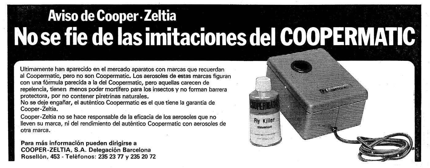 En 1977 fue lanzada una gran campaña publicitaria que tuvo su eco en numerosos periódicos (figura 4). Se trata de una interesante campaña porque se podían ver imágenes de los lugares donde se consideraba ideal aplicar el Coopermatic. Se veía un obrador de panadería, una tienda de comestibles o el comedor de un restaurante, todos ellos lugares dedicados a la industria alimentaria de los que era necesario eliminar importantes vectores como la mosca doméstica. Lógicamente, el aparato dispensador devino un éxito. Para el usuario era de fácil uso y eficaz. Y para Cooper-Zeltia era un buen negocio porque aseguraba la venta de insecticidas. Tal fue el éxito que aparecieron imitaciones. En una campaña lanzada en abril de 1980 (figura 5), se avisa contra las imitaciones. Bajo el título de «no se fíe de la imitaciones del Coopermatic», se puede leer: «Últimamente han aparecido en el mercado aparatos con marcas que recuerdan al Coopermatic, pero no son Coopermatic. Los aerosoles de estas marcas figuran con una fórmula parecida a la del Coopermatic, pero aquellas carecen de repenlencia, tienen menos poder mortífero para los insectos y no forman barrera protectoras, por no contener piretrinas naturales. No se deje engañar, el auténtico Coopermatic es el que tiene la garantía de Cooper-Zeltia.» He de apuntar que esta empresa tenía razón cuando hablaba de la capacidad de repeler del pelitre. Aunque el formulado no solo era eficaz gracias a esta sustancia, sino también por el disolvente que debía llevar y que permitía una buena difusión.