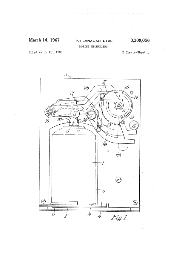 [2] Dosing mechanisms. Grant US3309056A. Flanagan Peter Cooper Mcdougall & Robertson. Priority 1962-03-30. Filing 1963-03-25. Publication 1967-03-14.