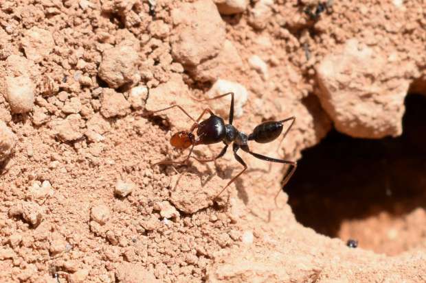 Una característica de esta especie es que las obreras alzan el gastro apuntando hacia arriba cuanto se encuentran en movimiento. Esto se puede apreciar en algunas de las imágenes de esta entrada (figuras 5 a 9). Este comportamiento lo comparten con otras especies afines que se encuentran dentro de lo que se denomina grupo albicans, en honor a C. albicans, especie desertícola abundante en el norte de África [2]. Esta especie es monogínica y polidómica. Es decir, tiene una sola reina, pero construye varios nidos satélite. Sin embargo, en uno solo se aloja la reina. Esto implica que las obreras deben visitar frecuentemente a la reina para conservar el olor de la colonia. La entrada, como en otras Cataglyphis, es un simple agujero en el suelo. En la imagen número 4, se puede ver una piedra bajo la cual encontré obreras. Fue por casualidad que la levanté. Sin embargo, la entrada del nido no estaba pegada a la piedra, sino algo alejada.
