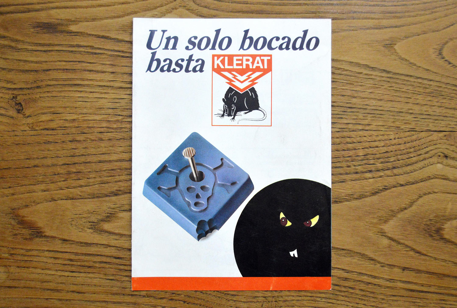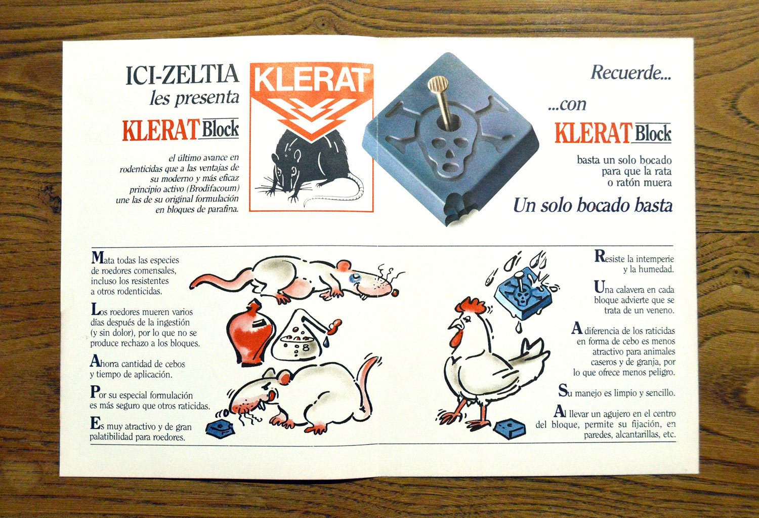 Como se puede leer en el folleto, el eslogan utilizado es «un solo bocado basta». Esta idea contraponía KLERAT a los otros rodenticidas formulados con anticoagulantes de primera generación como warfarina, cumatetralilo y clorofacinona, muy utilizados entonces. En la imagen número 4, se puede ver el interior del folleto publicitario donde se recogen todas las ventajas de KLERAT BLOCK: palatable para los roedores, poco atractivo para otros animales, ahorro de producto, ahorro de tiempo, resistente a la intemperie, seguro para las personas y mata los roedores resistentes a otros rodenticidas.
