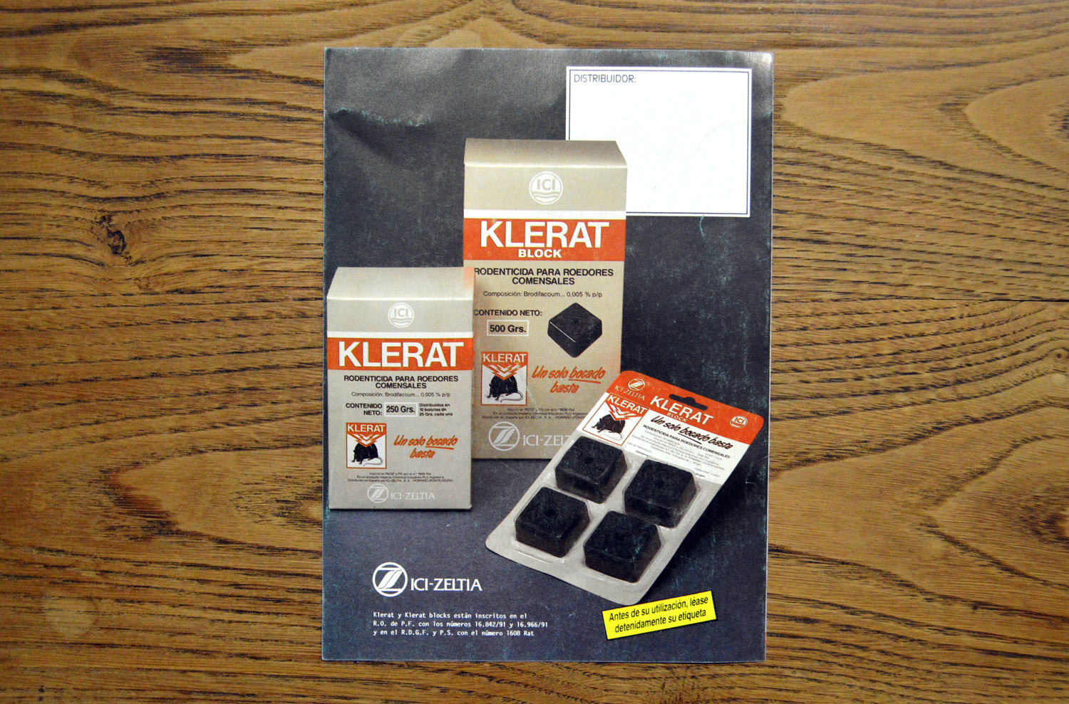 Como se puede ver en la contraportada del folleto publicitario, en el mercado español fueron lanzados dos formulados con brodifacoum. Se comercializó KLERAT (grano en bolsitas de 25 gramos) y KLERAT BLOCK. Ambos productos fueron fabricados probablemente en el Reino Unido. Desconozco el año exacto en el que fueron comercializados por primera vez en España. El folleto fue pensado para el sector agrícola y ganadero. Desconozco si KLERAT tuvo un lanzamiento anterior para el usuario doméstico o para sanidad ambiental.