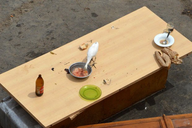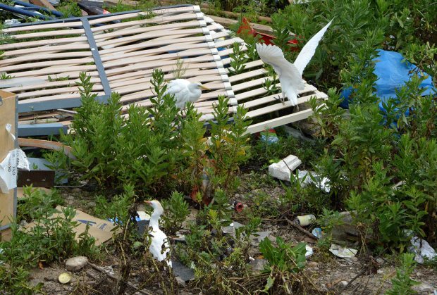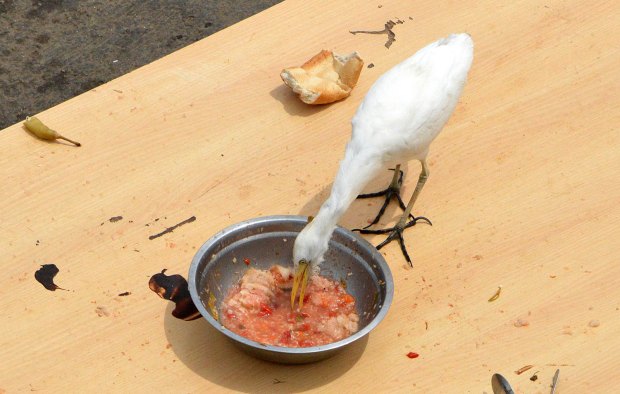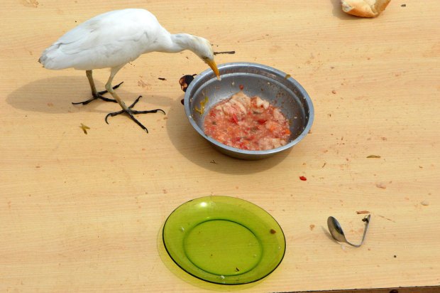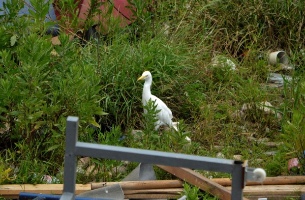 Como nota de color ante este triste panorama, pude ver un grupo de garcillas bueyeras (Bubulcus ibis) buscándose la vida. Recursos no faltaban, ya que había comida a mano. De hehco, había una mesa con restos de comida de donde picoteaban las garcillas. Este ave se encuentra bien adaptada a la convivencia con las personas. Desde hace más de 100 años, se encuentra en expansión por todo el mundo [1]. Originaria de la zona tropical de África y Asia, a principios del siglo XX empezó a colonizar nuevos territorios. Ahora se la encuentra desde América hasta Oceanía. En Barcelona, parece que se ha adaptado bien y se la puede ver todo el año. En febrero de 2014, tomé unas fotografías en el Mercado del Besós, lugar donde acude habitualmente a comer [2]. Se la puede ver sobre el tejado a la espera de que algún desperdicio caiga fuera de los contenedores. Es habitual verla en vertederos. Es quizás esta adaptación a aprovecharse de los humanos, lo que ha facilitado su expansión.