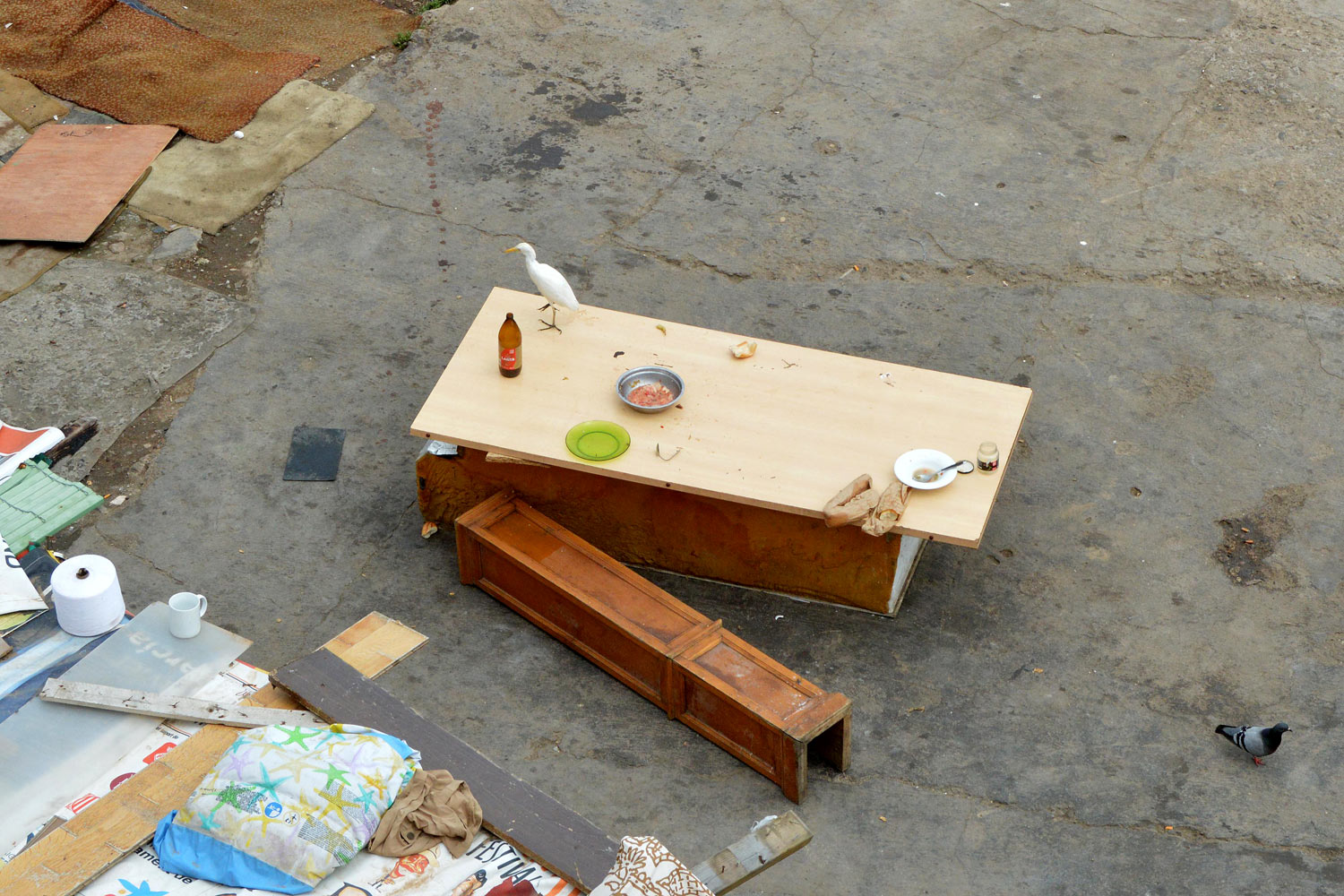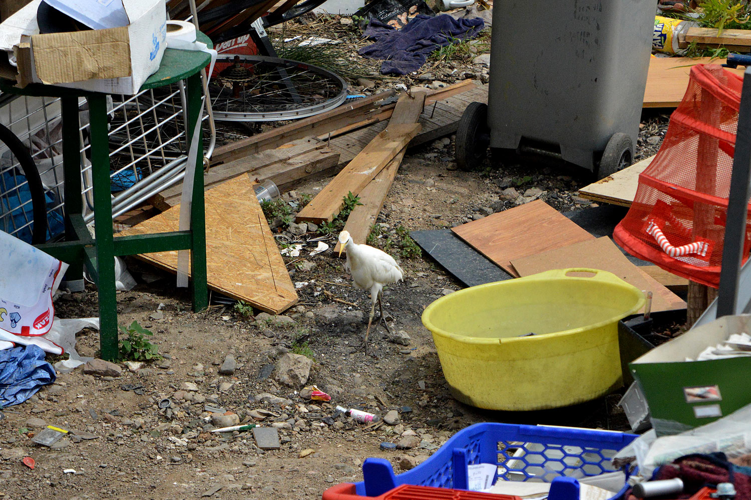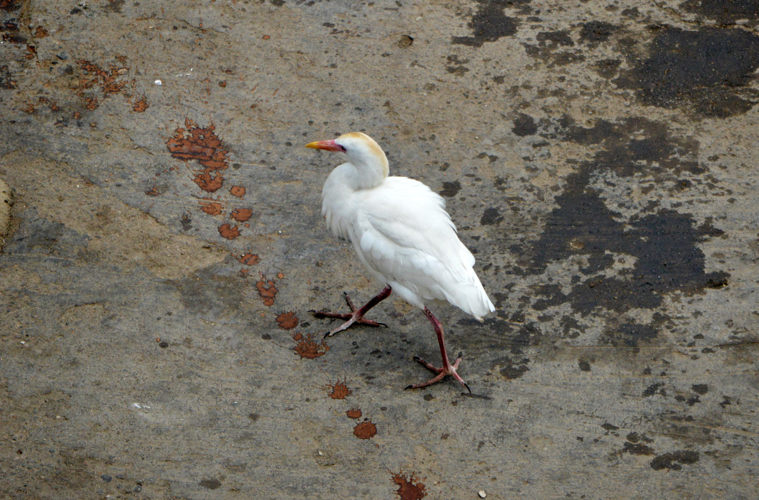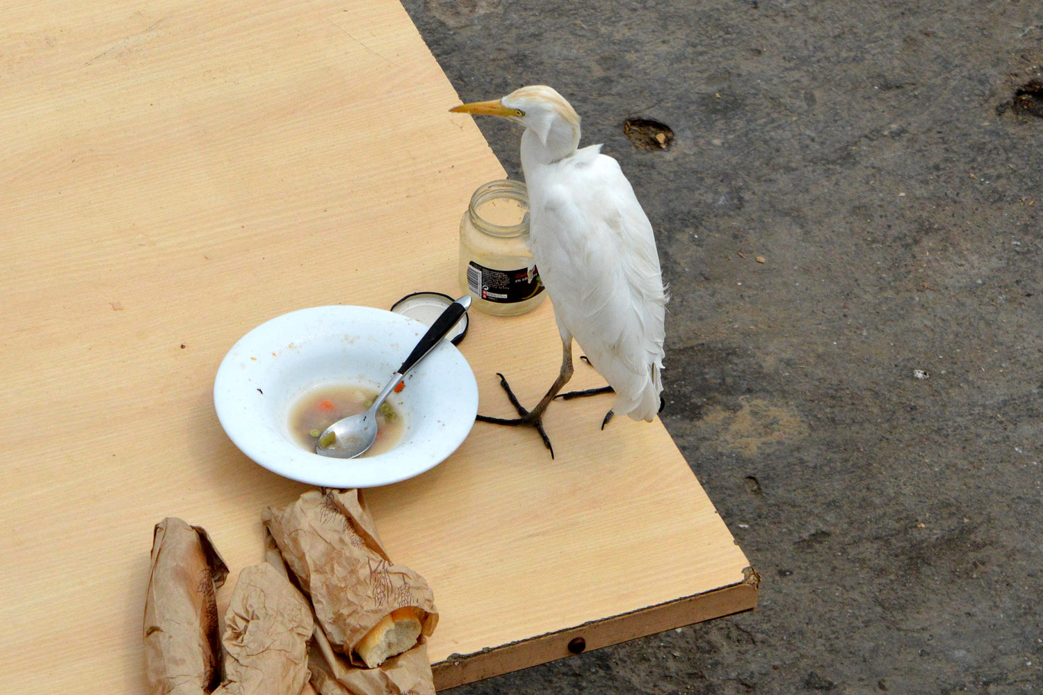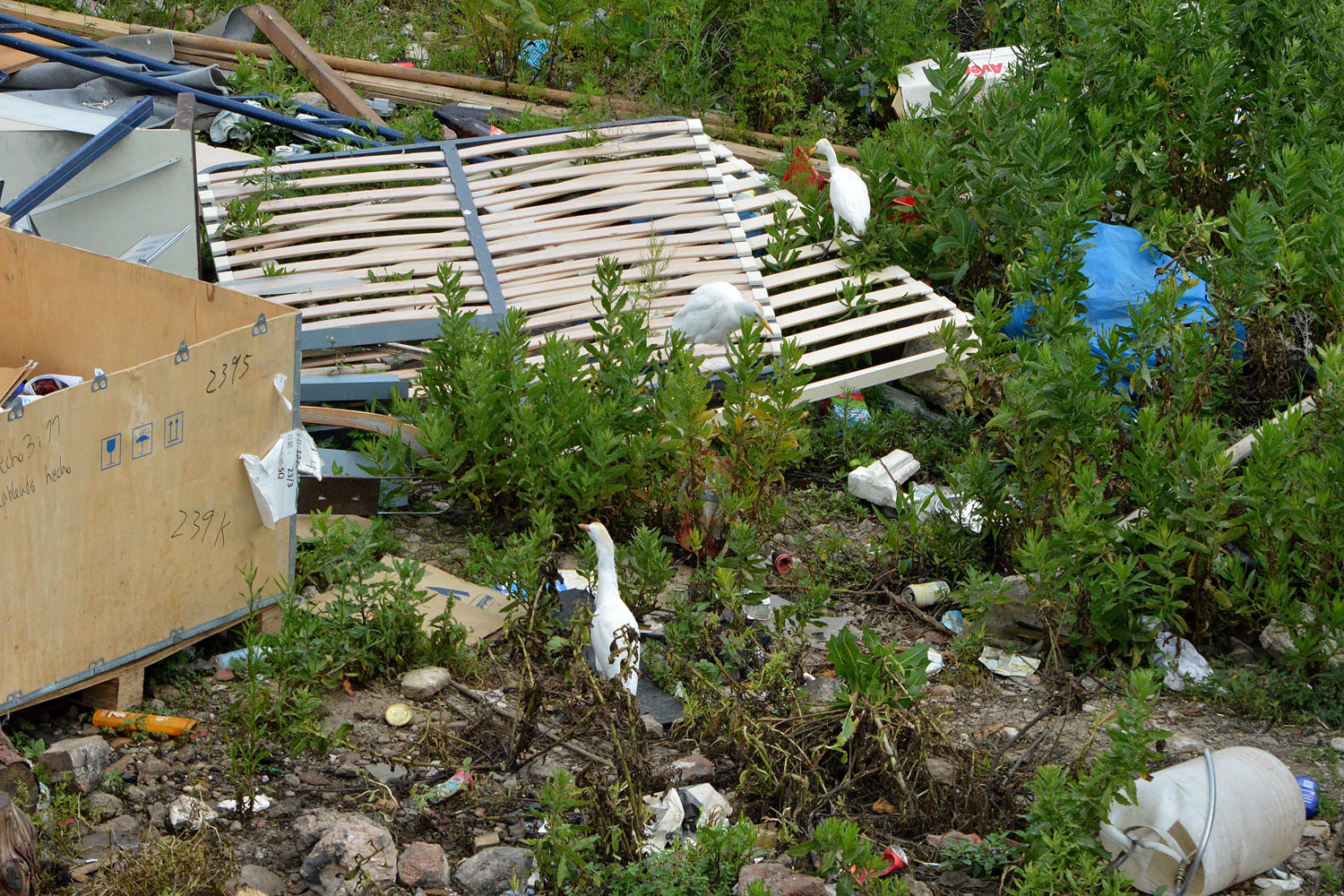 Como nota de color ante este triste panorama, pude ver un grupo de garcillas bueyeras (Bubulcus ibis) buscándose la vida. Recursos no faltaban, ya que había comida a mano. De hehco, había una mesa con restos de comida de donde picoteaban las garcillas. Este ave se encuentra bien adaptada a la convivencia con las personas. Desde hace más de 100 años, se encuentra en expansión por todo el mundo [1]. Originaria de la zona tropical de África y Asia, a principios del siglo XX empezó a colonizar nuevos territorios. Ahora se la encuentra desde América hasta Oceanía. En Barcelona, parece que se ha adaptado bien y se la puede ver todo el año. En febrero de 2014, tomé unas fotografías en el Mercado del Besós, lugar donde acude habitualmente a comer [2]. Se la puede ver sobre el tejado a la espera de que algún desperdicio caiga fuera de los contenedores. Es habitual verla en vertederos. Es quizás esta adaptación a aprovecharse de los humanos, lo que ha facilitado su expansión.