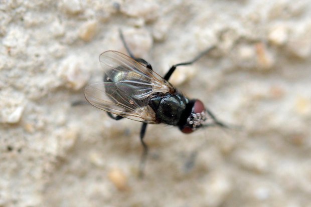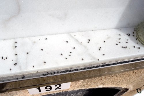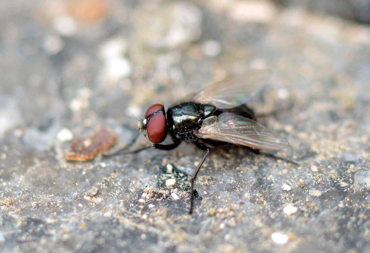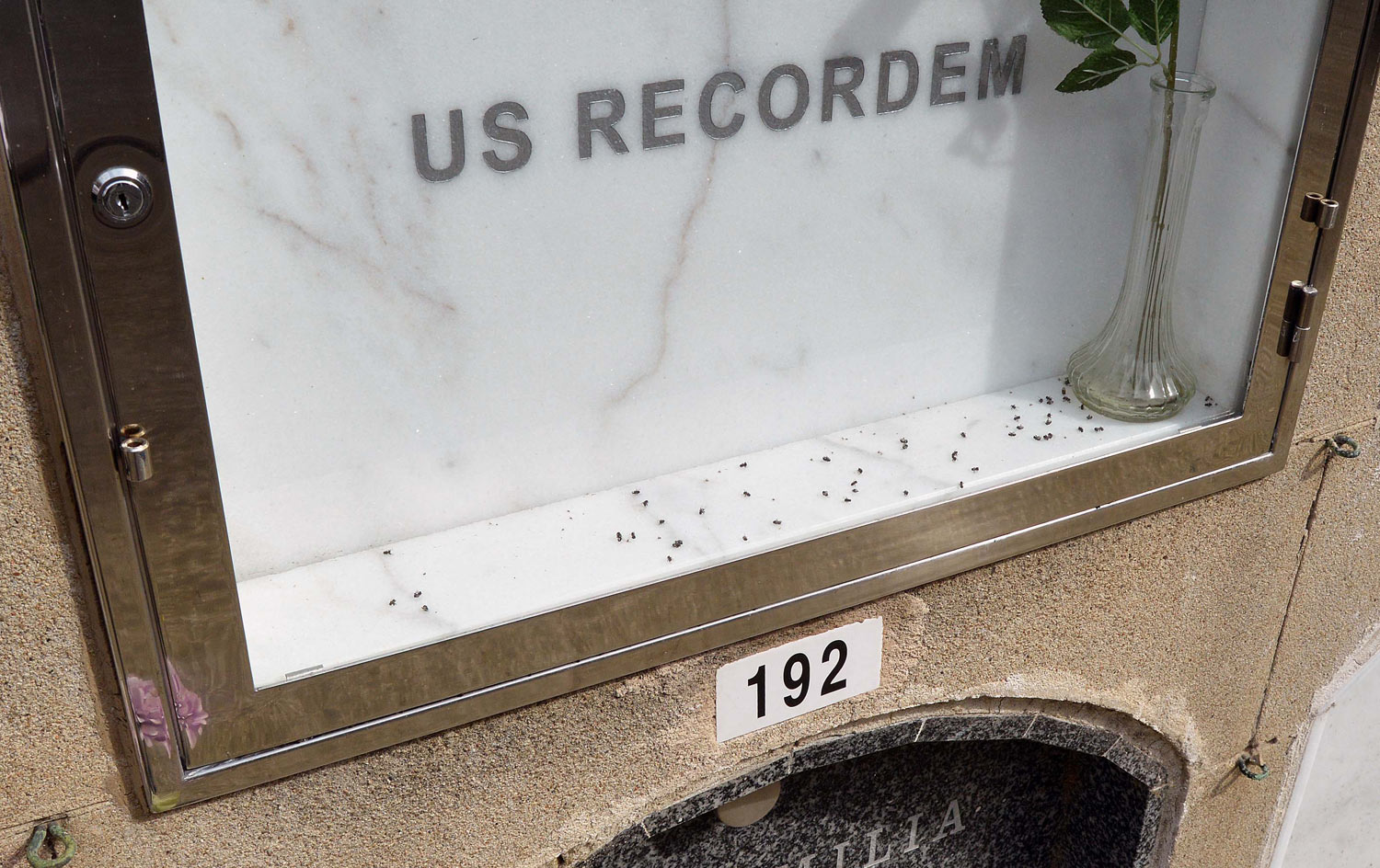En segundo lugar pude ver moscas del género Hydrotaea (antes Ophira). Se podían encontrar ejemplares sueltos por todo el cementerio. Sin embargo, se concentraban alrededor de algunos nichos. Estas moscas acuden a depredar larvas de otros dípteros. Son comunes también en basureros, por ello también se las conoce como moscas de las basuras. En las imágenes 2 a 4, se puede ver la parte frontal de un nicho donde se acumula gran cantidad de ejemplares de Hydrotaea que han completado su ciclo vital. Y en la imagen 5, se puede ver un nicho que no se encontraba bien sellado y del que entraban y salían. Al acercarme, noté un ligero hedor a descomposición. Las moscas salían al exterior en lo que parecía una búsqueda de pareja. para la cópula. Capturé unas cuantas y me pareció que estaba ante una misma especie. En las imágenes 6 a 12, se pueden ver algunas fotografías que tomé. Destaca el hecho de que las moscas estaban cubiertas de ácaros blancos. Es comprensible que, en el interior del ataúd, se acumule una gran cantidad de humedad que permite el gran desarrollo de los ácaros.