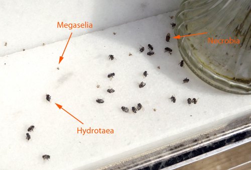 Sin embargo, lo que me llamó la atención fue la numerosa Necrobia rufipes que había (figuras 13 a 15). Esto es algo normal en esta época en un cementerio. Al ver estos coleópteros, me decidí por los insectos relacionados con los cadáveres (entomología cadavérica). No vi Necrobia ruficollis, especie que sí tengo constatada en el cementerio de Montjuic [1]. Y junto a este coleóptero, destacaban dos grupos de dípteros. En primer lugar había muchas moscas fóridas (Phoridae). La común de esta familia no es otra que la conocida como mosca jorobada. Es omnipresente y yo identifico como Megaselia scalaris, o una especie muy parecida. Megaselia es de distribución mundial y la encontramos en registros de albañal y alcantarilla. Y también la tenemos en bares y restaurantes en zonas donde hay materia orgánica y humedad. Ya dediqué una entrada a esta mosca en cementerios [2]. Hace dos años quedé impresionado al ver los restos de huesos en un osario cubiertos de pupas de Megaselia.