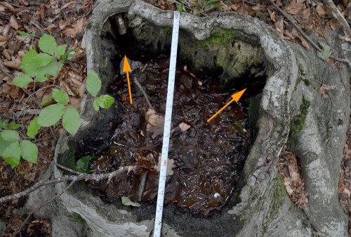 A veces, estos huecos son cavidades de pequeño tamaño. Pero en este caso era grande, ya que estaba dentro de un tocón de haya (figura 2). En la imagen número 3 se puede ver que esta cavidad tenía un diámetro aproximado de 30 centímetros. Había acumulada una buena cantidad de agua. Pude ver larvas y pupas de Aedes geniculatus en las esquinas indicadas mediante flechas. También pude ver un par de adultos que habían salido de su fase de pupa y estaban reposando sobre las paredes. Y también se acercó volando alguna hembra para picarme, aunque sin éxito.