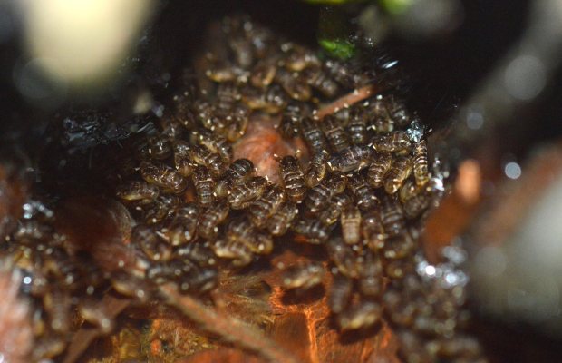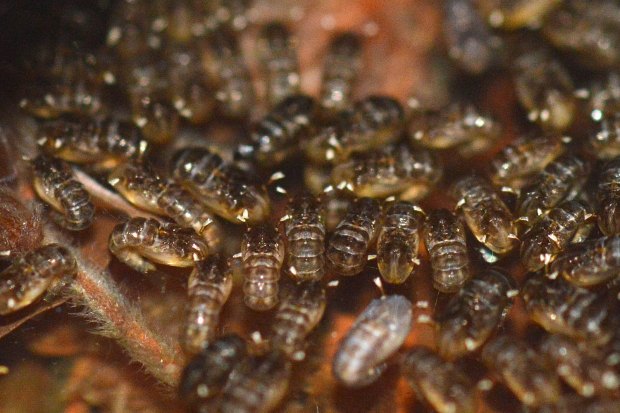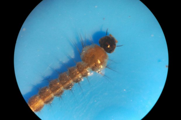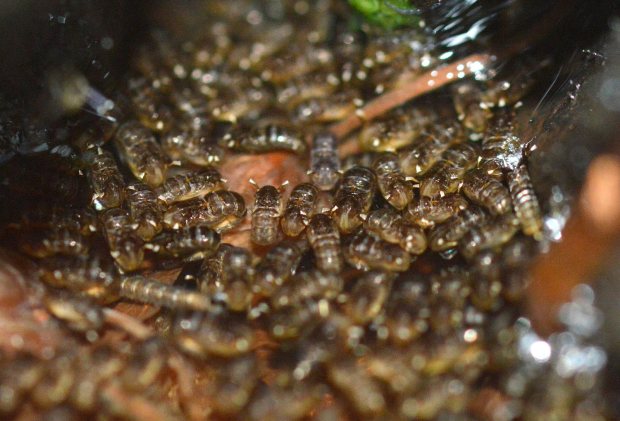 Al cabo de unas horas de acomodar la muestra de larvas y pupas en un recipiente adecuado, empezaron a emerger adultos. Durante dos días aparecieron machos. Y luego, unas pocas hembras. En otra entrada, mostraré las imágenes que tomé de los adultos.