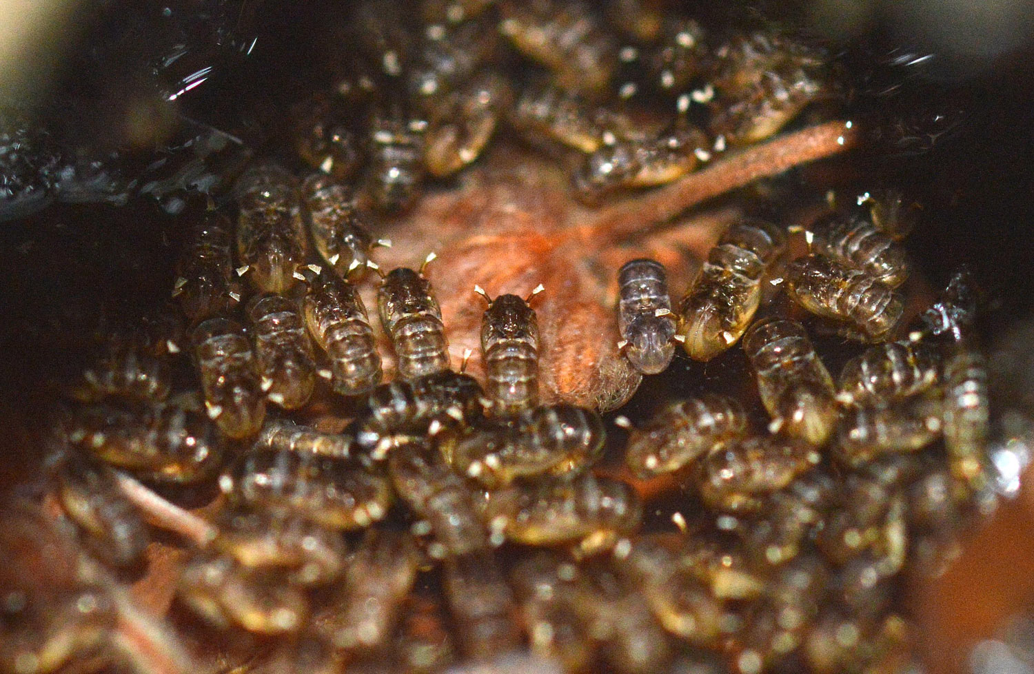 Encontré gran cantidad de larvas y pupas. En las imágenes de esta entrada doy detalle de ello (figuras 6 a 16). Me llevé una muestra a casa para observar larvas y pupas (figuras 17 a 21). Con la lupa binocular observé las larvas (figuras 22 a 24). En principio, lo que encontré en ese hueco de árbol fueron diferentes fases de desarrollo de Ae. geniculatus. Esperaba también encontrar Anopheles plumbeus, otra especie arborícola que se encuentra en la zona. En julio de 2016, dediqué una entrada a esta otra especie que encontré en el hayedo de Santa Fe del Montseny, cerca de la Font del Passavets, a unos 1.200 metros de altitud [1].