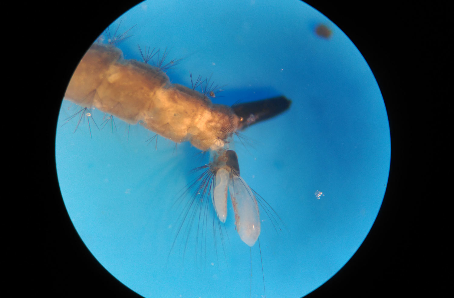 Al cabo de unas horas de acomodar la muestra de larvas y pupas en un recipiente adecuado, empezaron a emerger adultos. Durante dos días aparecieron machos. Y luego, unas pocas hembras. En otra entrada, mostraré las imágenes que tomé de los adultos.
