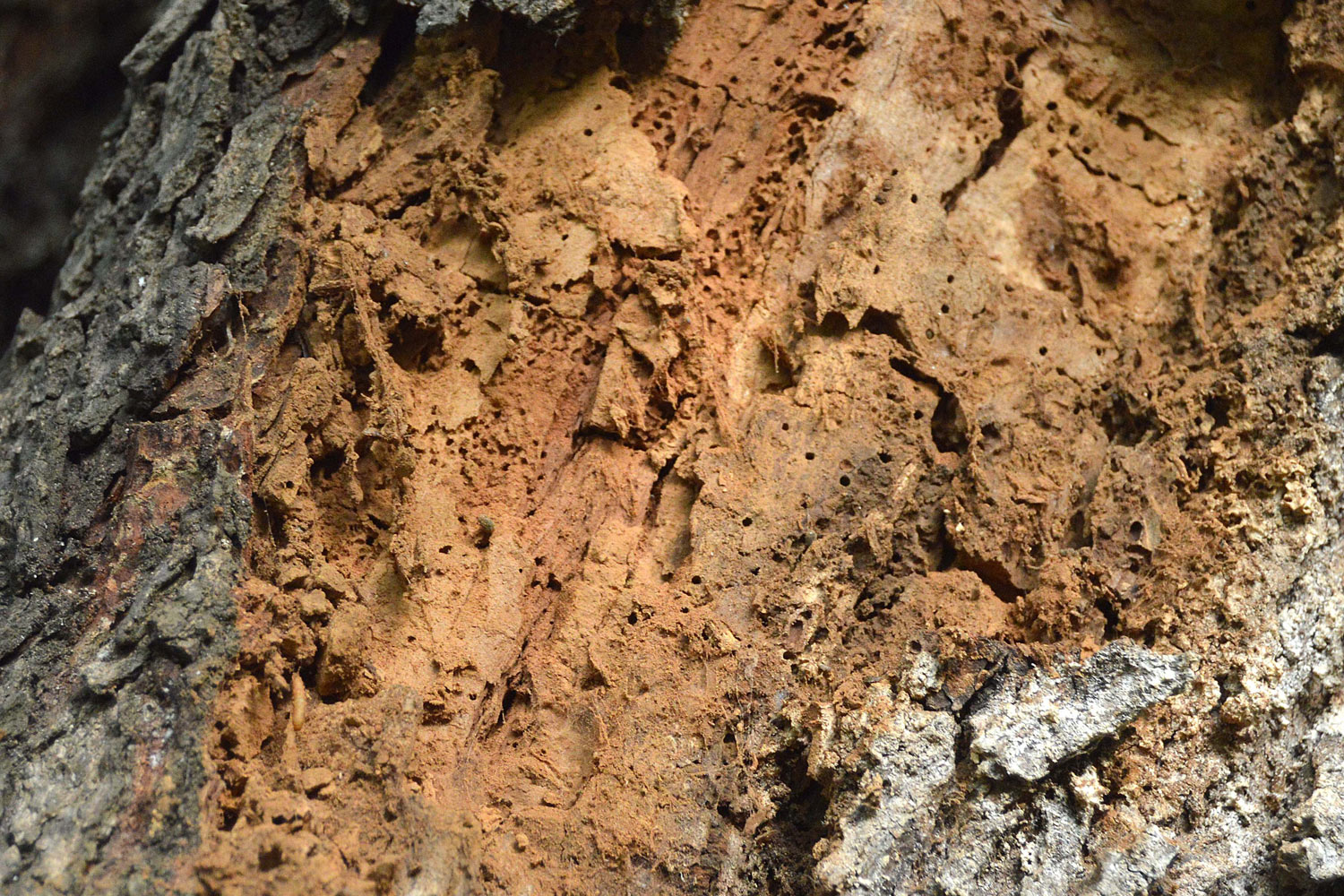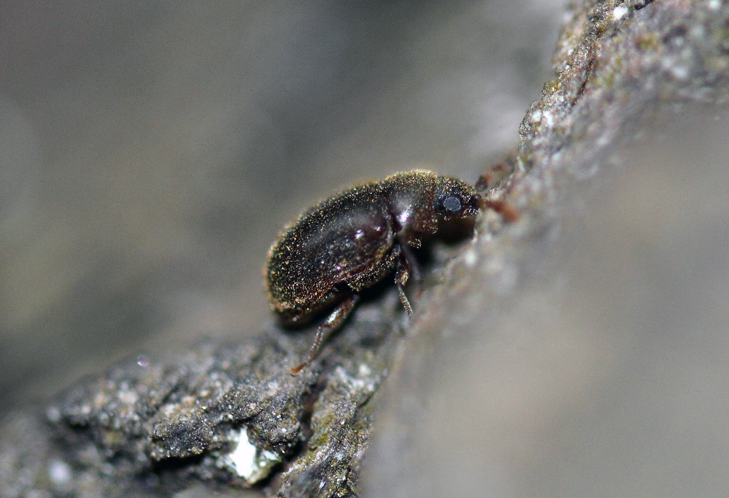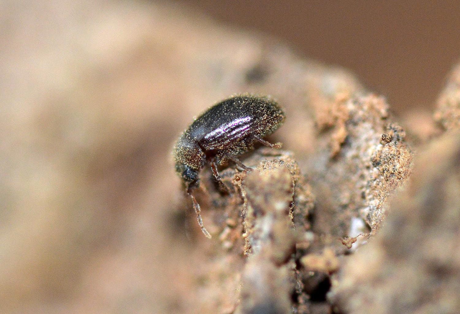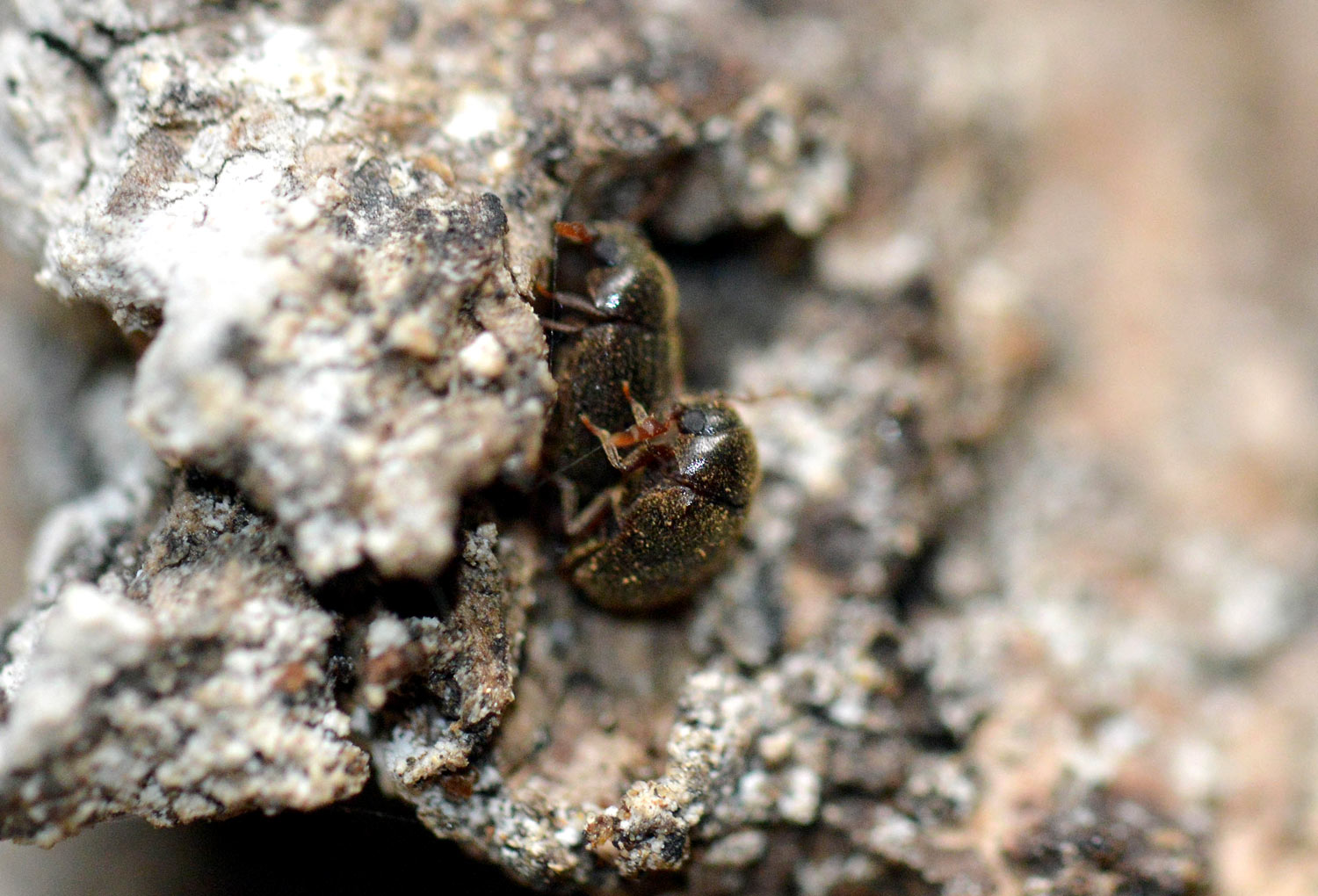 Estuve un rato observando los adultos y tomé fotografías para dar cuenta de su aspecto. Como se puede ver en la imagen número 1, miden entre 2 y 2’5 mm. Tienen un aspecto redondeado y son de color marrón oscuro. El pronoto y los élitros están cubiertos de abundantes pelos entre los que queda retenido el serrín que se acumula en las galerías (figura 6). Es característica la forma de las antenas. La maza está formada por tres grandes segmentos con un perfil característico (figura 14). Un detalle que me pareció interesante es que la madera carcomida parecía afectada por un hongo de pudrición parda. Este tipo de hongos se alimentan de la celulosa dejando la lignina y de ahí su coloración marrón. Al retirar algo de corteza, pude ver que la madera se iba deshaciendo con cierta facilidad.