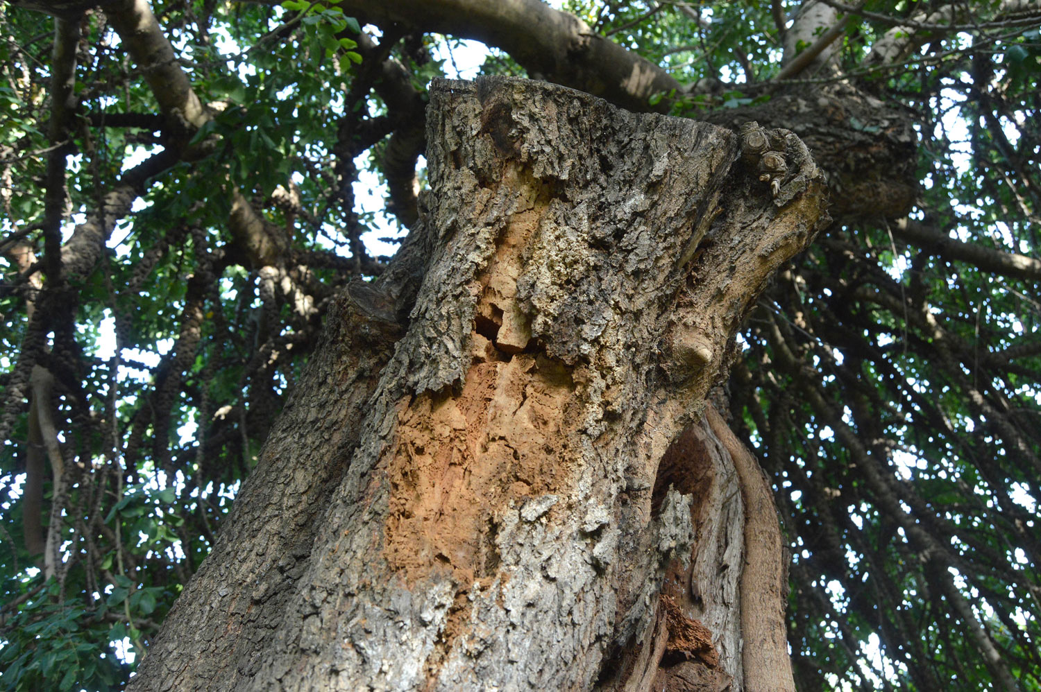 Hace un par de semanas, paseaba cerca de mi casa en Santa Coloma de Gramenet (Barcelona). Llevaba un rato observando árboles en busca de insectos. Como es época de emergencia de adultos de coleópteros xilófagos, iba mirando troncos en los que veía perforaciones de salida. Me acerqué a un árbol añejo que tenía una rama muerta (figura 2). Por su extremo se constataba que en el pasado fue podada. La rama muerta era de medio metro. Se veía seriamente afectada por alguna especie de carcoma (figura 3). Entonces me di cuenta de que a su alrededor volaban pequeños coleópteros. Al seguir con la mirada uno, vi que se posó sobre la rama afectada y que empezó a corretear de un lado para otro. Descubrí que había otros coleópteros muy parecidos. Vi que se estaban buscando y que algunos se juntaban para copular. Deduje que estaba en el momento de la salida de los adultos de una misma especie.