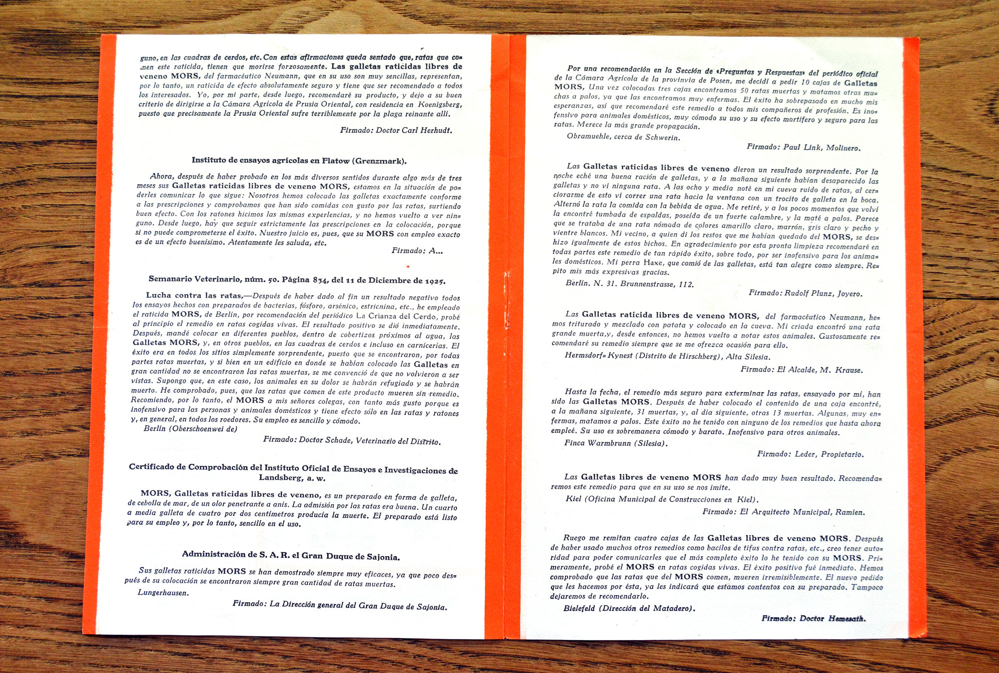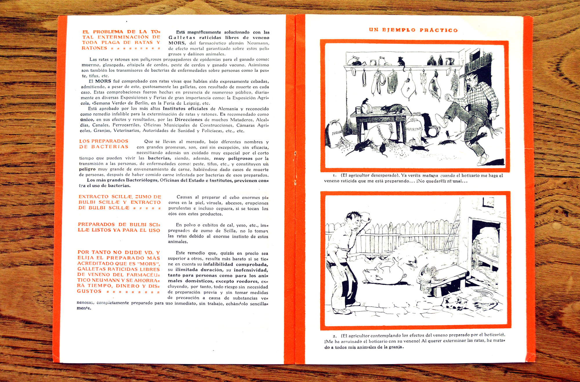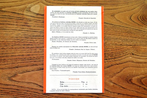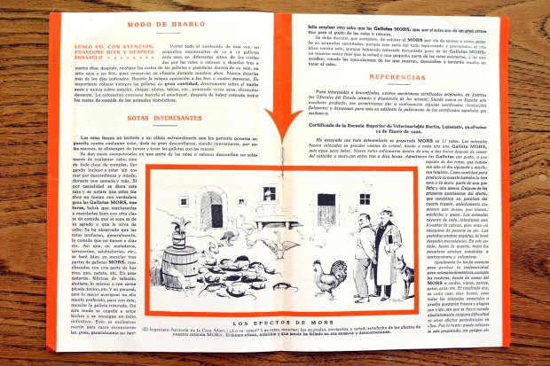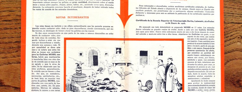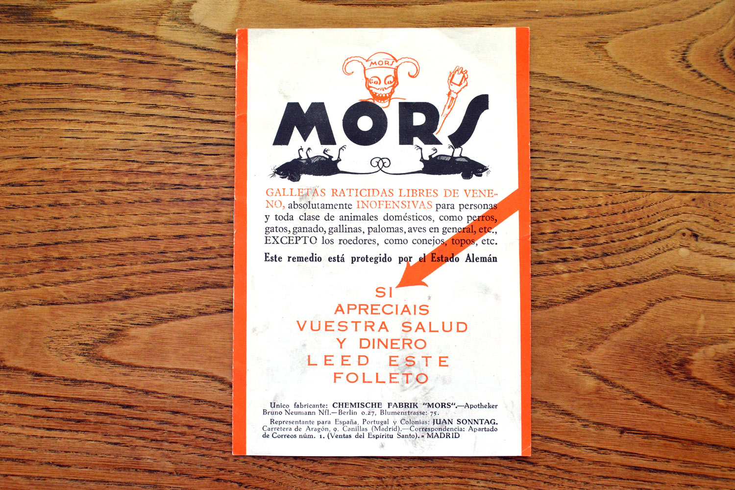 He encontrado un folleto publicitario de finales de la década de 1920 de un producto raticida llamado Mors. Descriptivo nombre. Se vendía bajo la siguiente descripción: «Galletas raticidas libres de veneno, absolutamente inofensivas para personas y animales domésticos excepto roedores».
