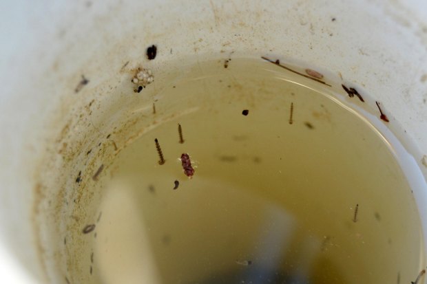 Observé muchos recipientes con agua acumulada. En especial destacaban los vasos de plástico para flores. Recogí una muestra de varios recipientes para identificar las especies. Encontré dos especies de mosquito, Ae. albopictus y de Culex pipiens, nuestro mosquito común. Y junto a los culícidos, también había larvas y pupas de ceratopogónidos (Ceratopogonidae) de especies no hematófagas.
