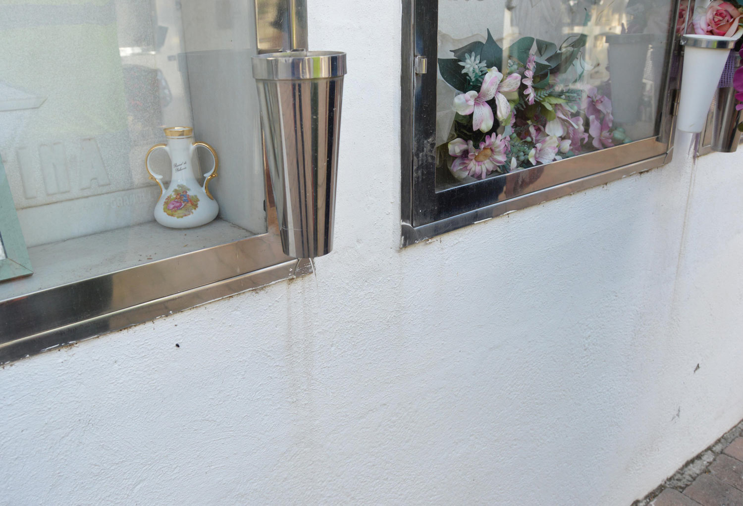 Un cementerio es un lugar ideal para el desarrollo de mosquitos debido a que hay gran cantidad de recipientes que acumulan agua donde las hembras pueden realizar su puesta [2]. En este cementerio, cada nicho cuenta con un recipiente para colocar flores. Tal y como se puede observar, los nichos están provistos de un agujero preparado para que se inserte un jarrón metálico que parece de serie. Lo interesante del caso es que cada jarrón metálico cuenta con una perforación en el fondo para que haga de sumidero y no se acumule agua (figura 1). Se entiende que quien haya diseñado el cementerio, tenía muy en cuenta evitar la proliferación de mosquitos. Ahora bien, en la práctica, ocurre lo contrario por falta de interés de las partes afectadas: gestores y usuarios del cementerios. Se constatan dos situaciones. La primera es que un buen número de jarrones metálicos estaban sucios (tierra, materia vegetal, etc.) y se acumulaba agua (figuras 2 a 5). La segunda es que la gran mayoría de jarrones metálicos había otro jarrón de plástico que carecía de sumidero. Así que el número de jarrones de plástico con agua era elevadísimo (figuras 6 a 12). Parece que los jarrones de plástico los colocan los usuarios sin la prohibición expresa de los gestores del cementerio.