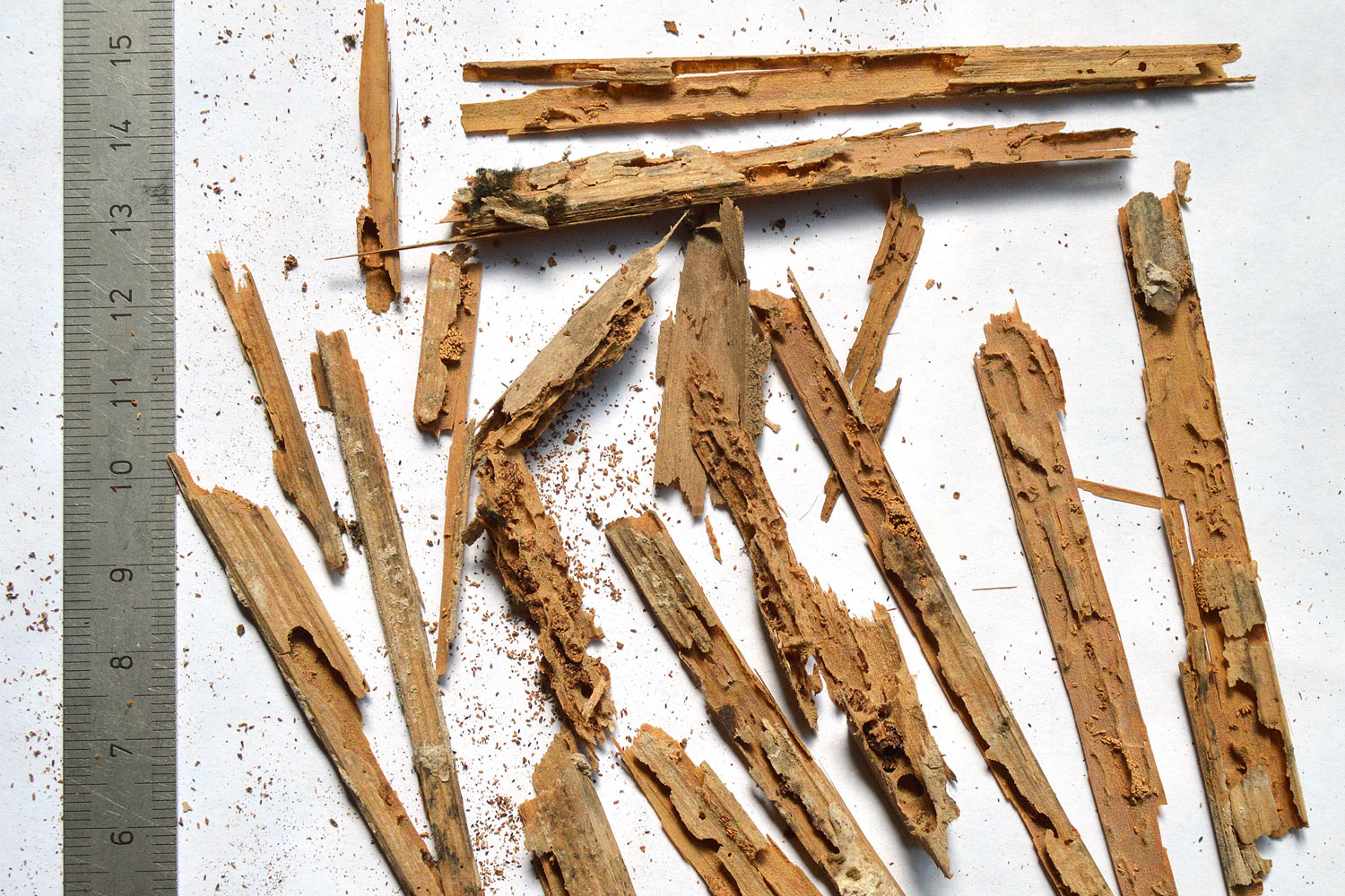 A lo dicho por Martín Diéguez, añadiría algo de lo que he observado para que se entienda la capacidad destructiva de O. ptilinoides. En primer lugar, porque además de atacar madera de frondosa, se las apaña con otras maderas como muestro en las imágenes de esta entrada, es decir, con la madera de caña (Arundo donax). Como se puede ver, O. ptilinodies atacó el cañizo de un falso techo hasta dejarlo hueco y sin estructura suficiente para sostener la capa de escayola. Esto provocó que parte del falso techo de una de las habitaciones de una vivienda se desprendiera. Y ello mostró el estado de las vigas del forjado. A partir de aquí se realizó un tratamiento de protección. En segundo lugar, como escribe Martín Diéguez, esta carcoma ataca también al duramen de frondosas. Y si la madera está algo húmeda, con ayuda de hongos, entrará sin problemas en el duramen. En tercer lugar, esta especie tiene un ciclo corto de uno o dos años. Es por ello que es más agresiva porque avanza más rápidamente que otras carcomas. En el caso de una ciudad como Barcelona u otra cualquiera pegada al Mediterráneo con inviernos suaves, el ciclo será, con toda seguridad, de un año.