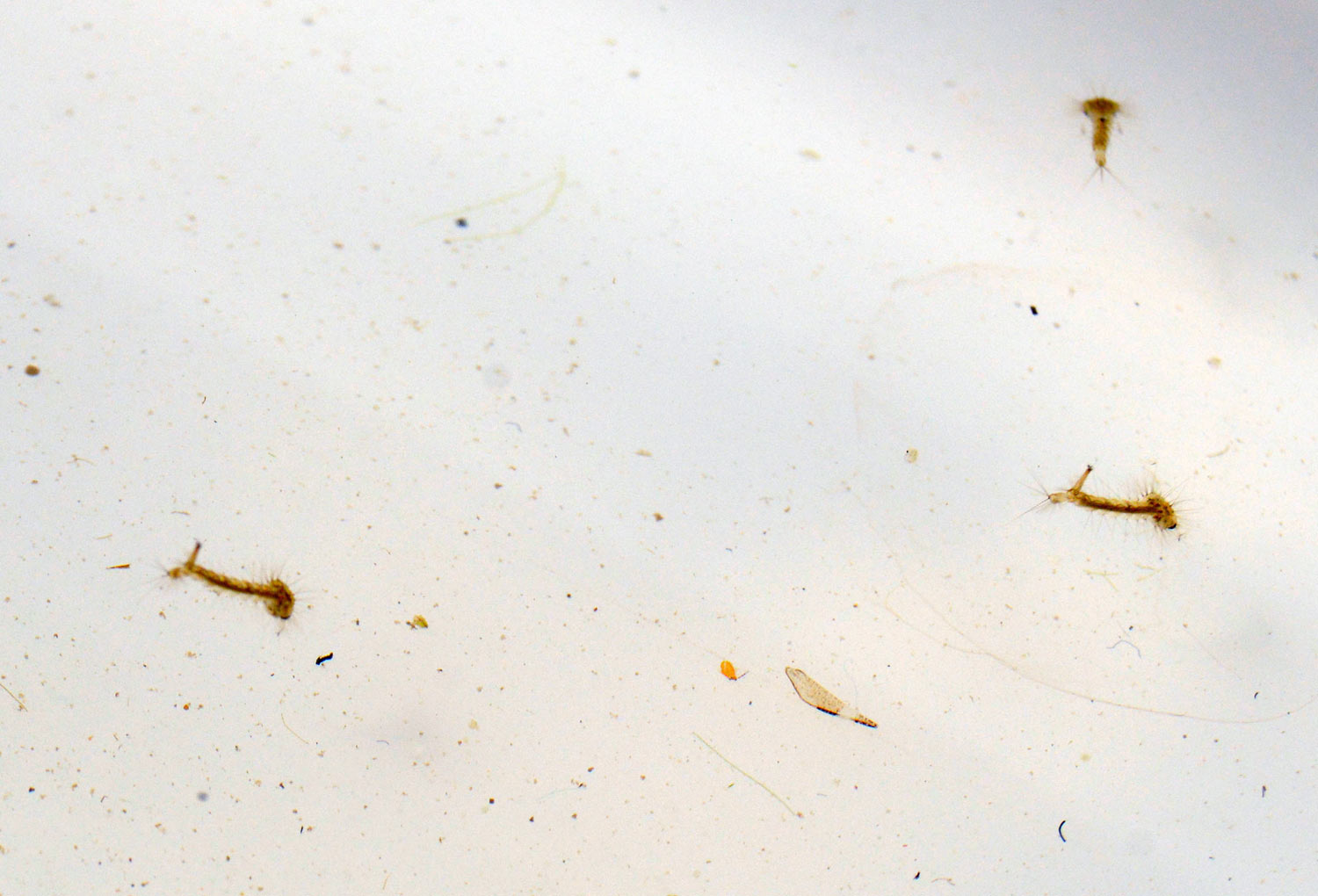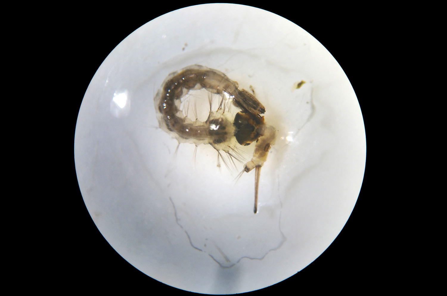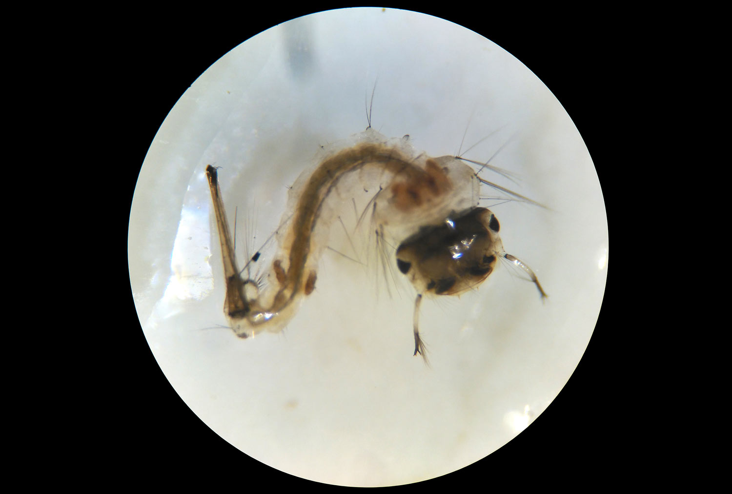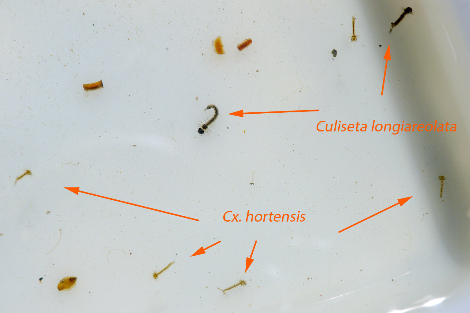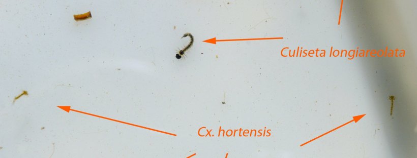 Cuando llegué a casa, las acomodé en un tarro de vidrio y las dejé sobre mi mesa. Y al cabo de tres días, me puse a mirarlas. Entonces vi solo larvas de Culiseta. Me pregunté dónde estaban las larvas de Culex. Y al azar, cacé una larva de Culiseta que puse bajo la lupa binocular. Miré. Y vi que la larva se estaba comiendo una larva de Culex (figuras 8 y 9). Tenía bien amarrada su presa y no la quería soltar. Volví a mirar en el tarro. Y tan solo encontré un par de larvas Culex. Y además me parecieron que estaban dañados (figura 11). Les faltaban pelos en el sifón. Parecían cortados. A falta de comida, las larvas de Culiseta se buscaron bien la vida. Quizás el ataque empiece por la cola. Por otra parte, si una larva de Culiseta depreda una larva de otra especie, entiendo que no le hará asco otra larva de su misma especie.