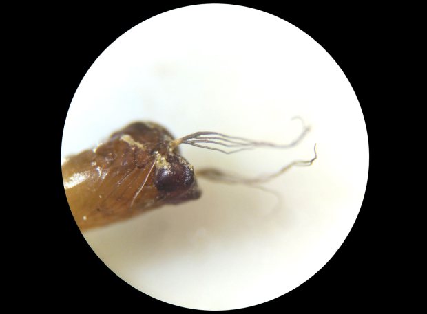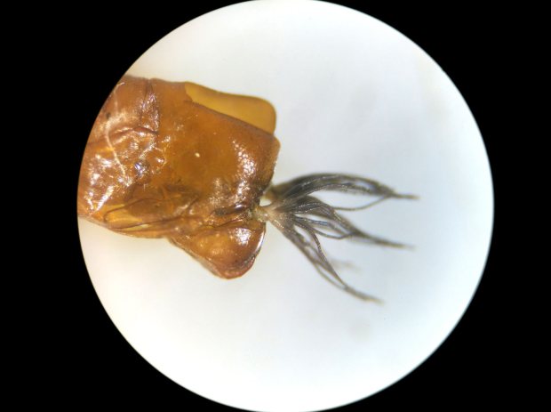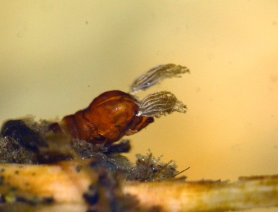 Por otro lado, algunas larvas de Simulium que encontré pertenecen a la especie Simulium (Nevermannia) cryophilum. Estas larvas tienen un detalle bien característico. Resulta que el diente tiene en cada lado cinco pequeños pelos que apuntan en la misma dirección que el diente. Según Gloria González es una especie «común en cursos de montaña y pre-montaña de pequeño tamaño». En el estudio sobre los simúlidos de Andorra, la autora dice que es poco común en los Pirineos y que la encontró en altitudes entre los 960 y los 2.020 metros.
