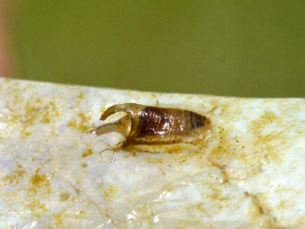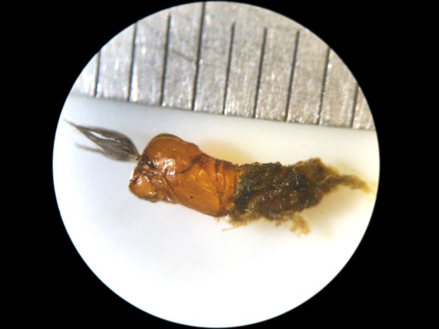 Respecto a Prosimulium, he llegado a la conclusión de que se trata de la especie Prosimulium (Prosimulium) rufipes. Encontré dos exuvias de pupa y varias larvas. La pupa se distingue por tener 16 filamentos respiratorios agrupados en 3 troncos basales. En la imagen número 9, se puede ver el característico diente de la larva. Las larvas y pupas de Prosimulium son de mayor tamaño que las de Simulium. Además, el estuche pupal es diferente. Prosimulium forma un estuche con un montón de hebras entrelazadas de forma heterogénea. P. rufipes, según Gloria González, se encuentra en arroyos y torrentes de áreas de montaña en Pirineos y Sierra Nevada. Esta misma autora, en otro trabajo dedicado a los simúlidos de Andorra [2], comenta que es una «especie muy frecuente en las montañas de Europa centro-meridional». En su estudio la encontró entre los 1.420 i 2.040 m. principalmente en agosto. En estos ambientes, las larvas se colocan en lugares con corriente fuerte y oxigenada.