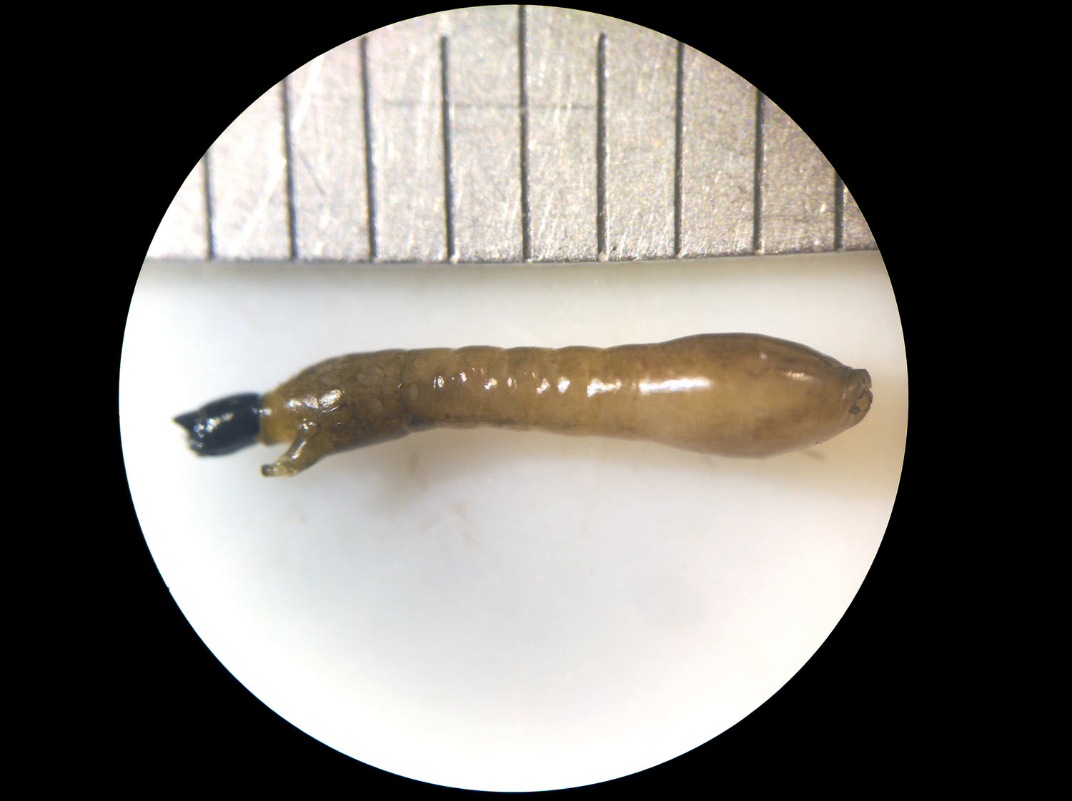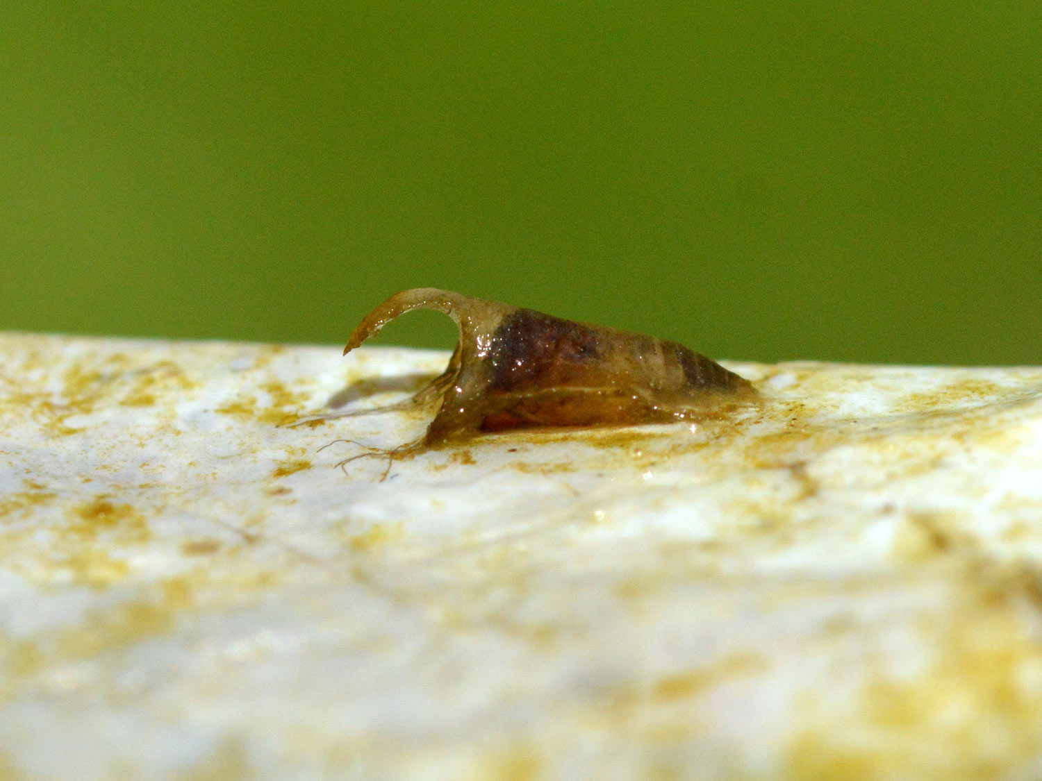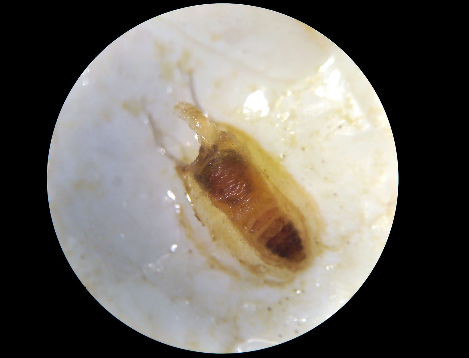 Por otro lado, algunas larvas de Simulium que encontré pertenecen a la especie Simulium (Nevermannia) cryophilum. Estas larvas tienen un detalle bien característico. Resulta que el diente tiene en cada lado cinco pequeños pelos que apuntan en la misma dirección que el diente. Según Gloria González es una especie «común en cursos de montaña y pre-montaña de pequeño tamaño». En el estudio sobre los simúlidos de Andorra, la autora dice que es poco común en los Pirineos y que la encontró en altitudes entre los 960 y los 2.020 metros.