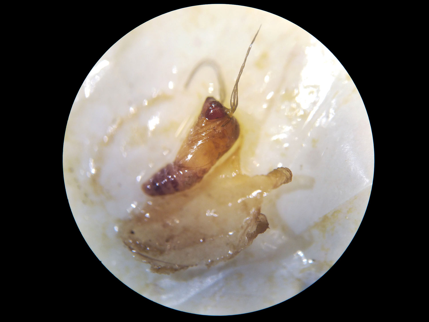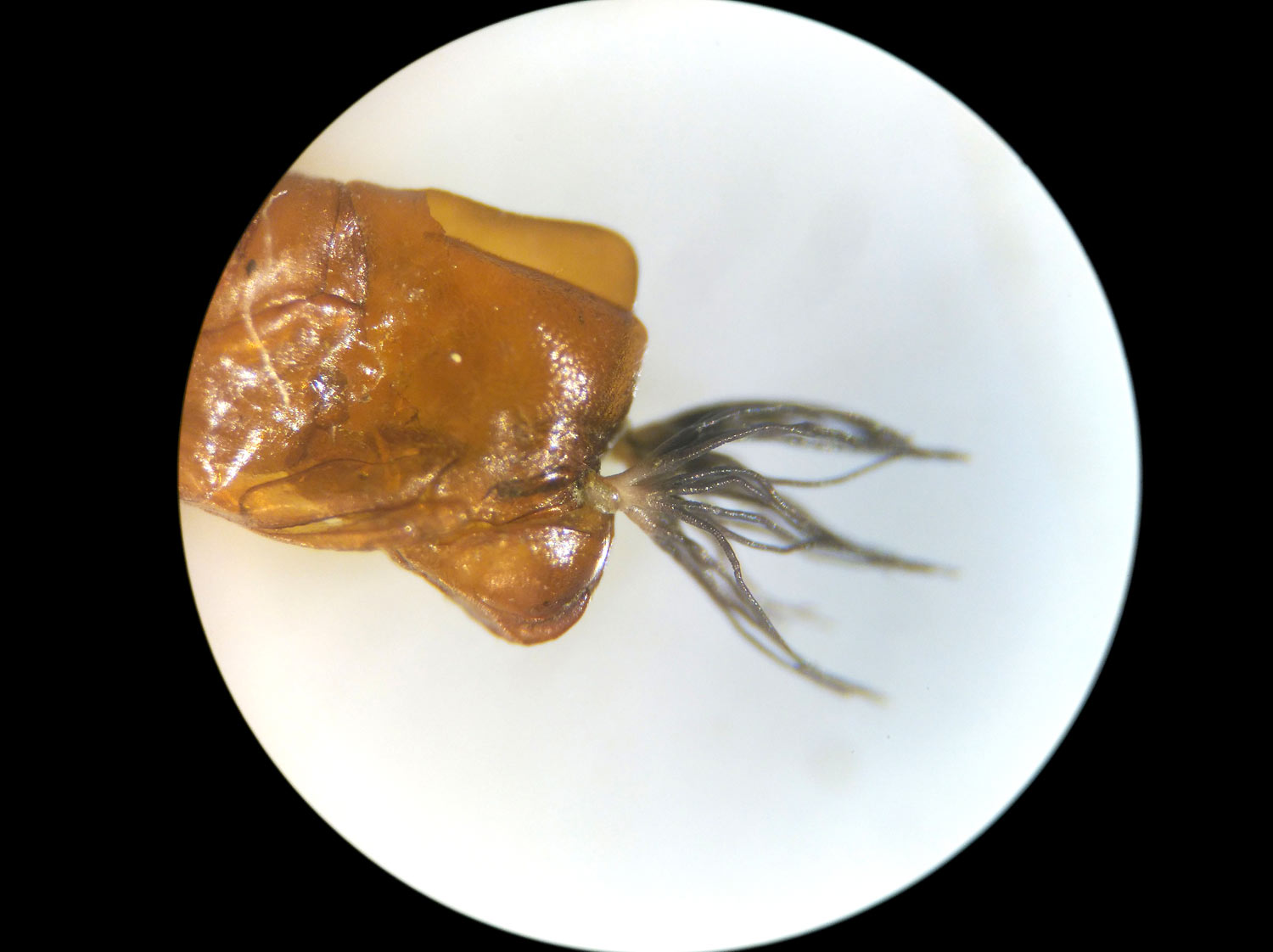 Respecto a Prosimulium, he llegado a la conclusión de que se trata de la especie Prosimulium (Prosimulium) rufipes. Encontré dos exuvias de pupa y varias larvas. La pupa se distingue por tener 16 filamentos respiratorios agrupados en 3 troncos basales. En la imagen número 9, se puede ver el característico diente de la larva. Las larvas y pupas de Prosimulium son de mayor tamaño que las de Simulium. Además, el estuche pupal es diferente. Prosimulium forma un estuche con un montón de hebras entrelazadas de forma heterogénea. P. rufipes, según Gloria González, se encuentra en arroyos y torrentes de áreas de montaña en Pirineos y Sierra Nevada. Esta misma autora, en otro trabajo dedicado a los simúlidos de Andorra [2], comenta que es una «especie muy frecuente en las montañas de Europa centro-meridional». En su estudio la encontró entre los 1.420 i 2.040 m. principalmente en agosto. En estos ambientes, las larvas se colocan en lugares con corriente fuerte y oxigenada.